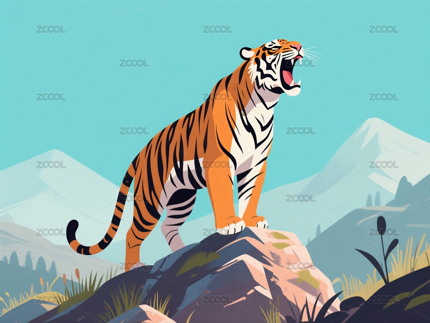 老虎站在山顶张嘴怒吼
