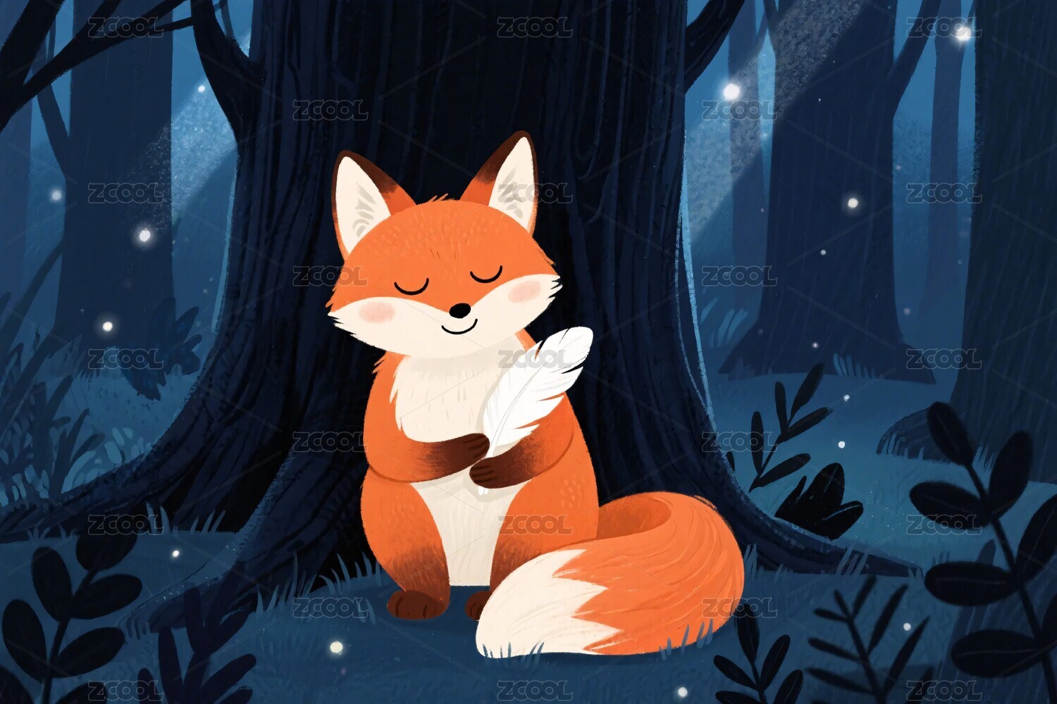 森林中的小狐狸抱着羽毛
