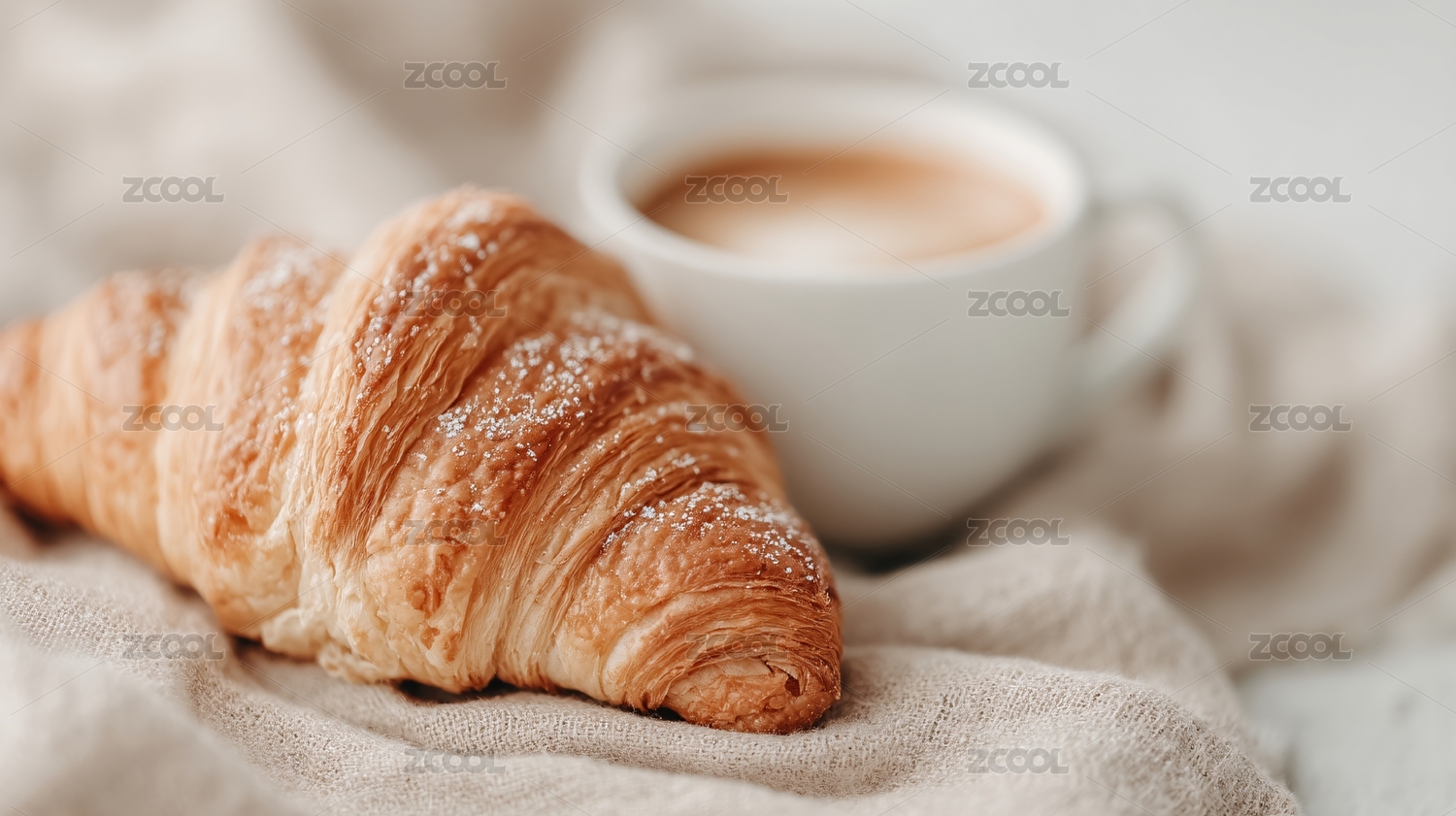 早餐桌上放着鸡蛋牛奶和牛角包特写