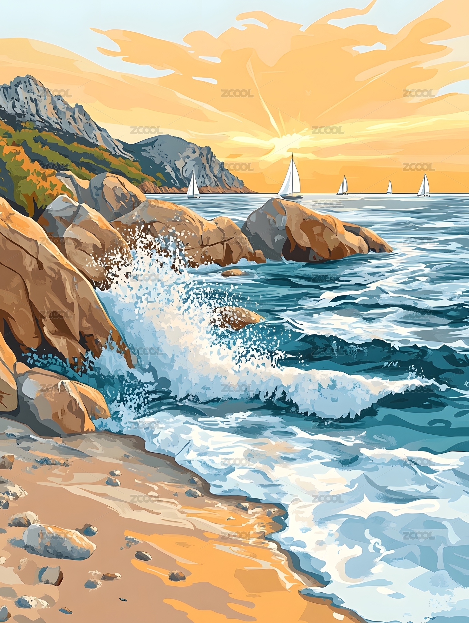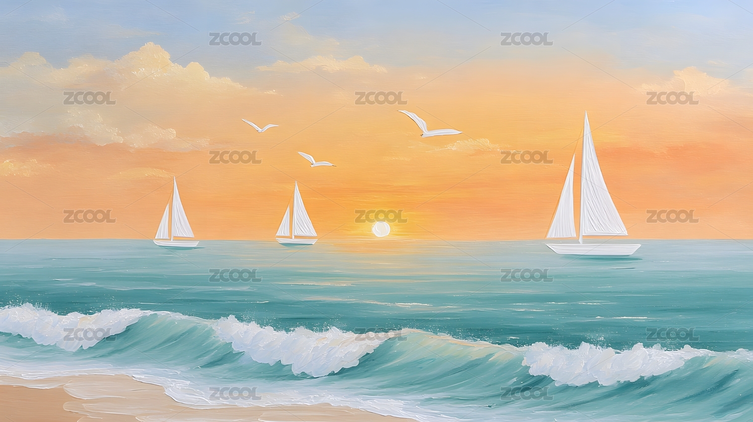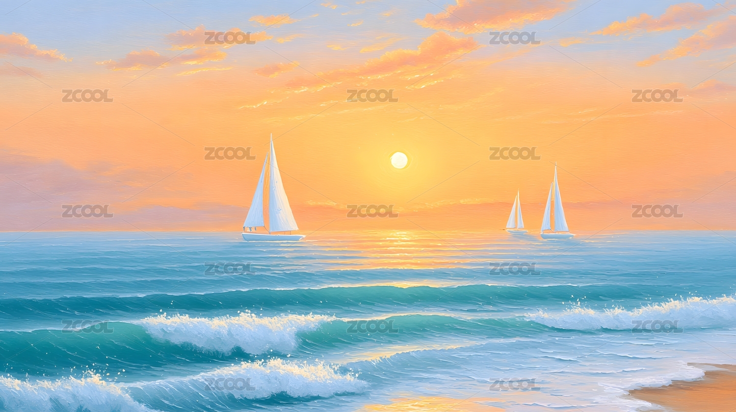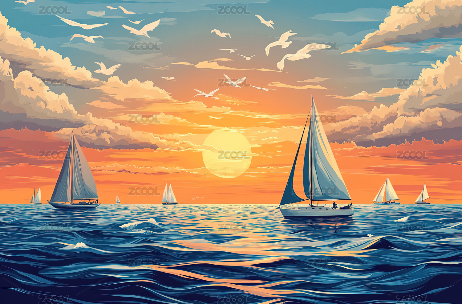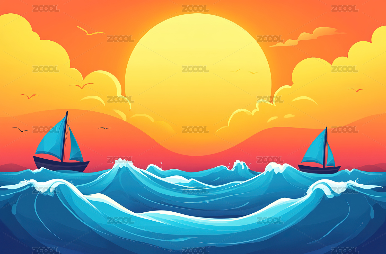 卡通风格蓝天白云大海沙滩背景下的一艘帆船
