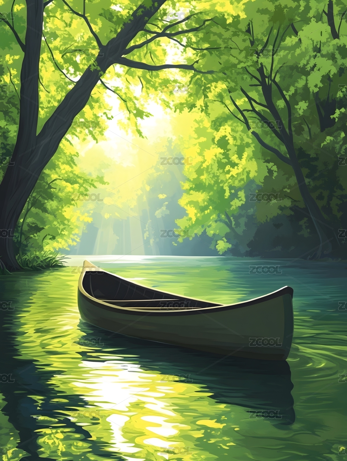 小船在绿树环绕的河流山水中