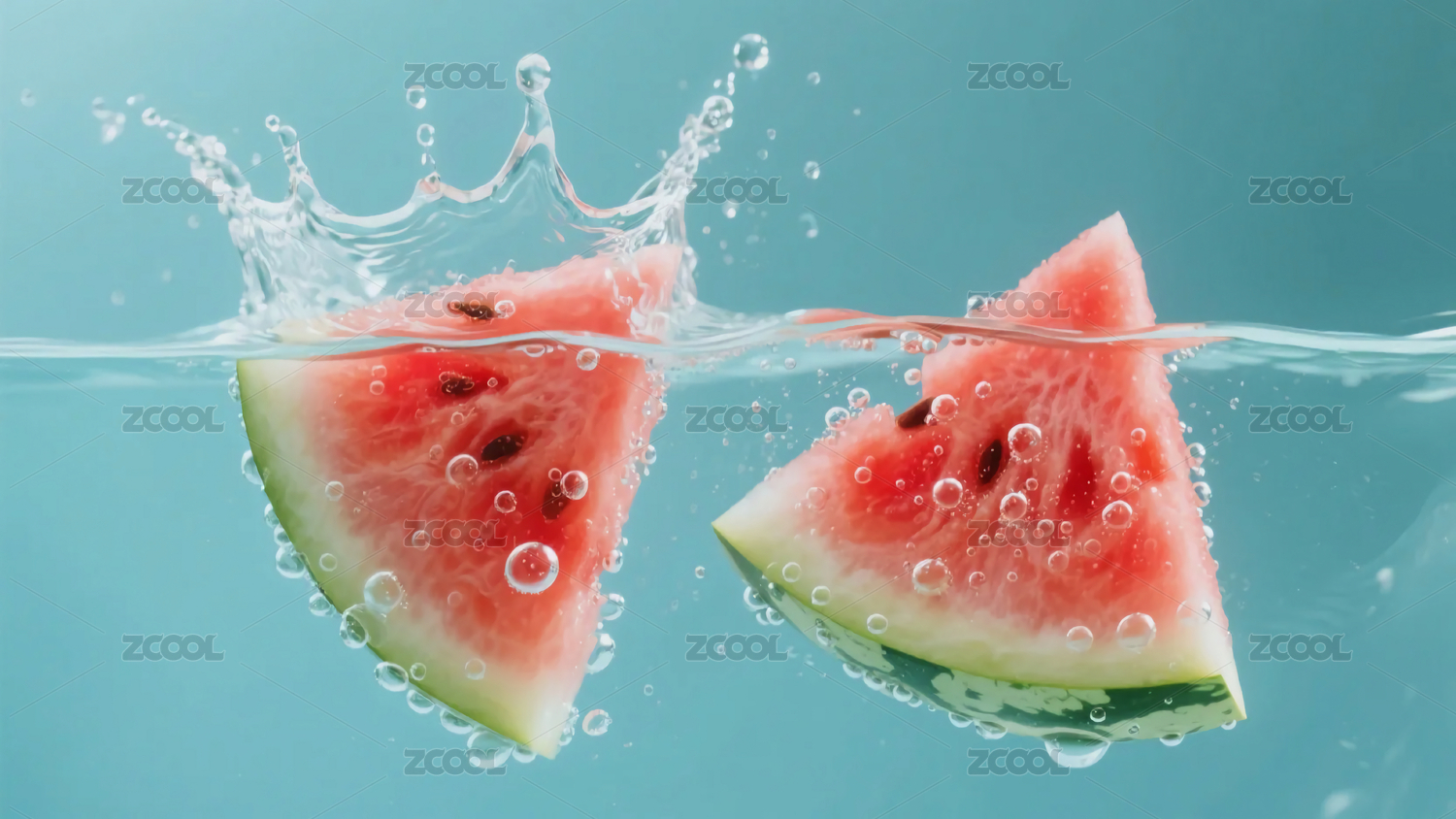 西瓜,红色,果肉,黑籽,蓝色,水面,波纹,水珠,清新,水果