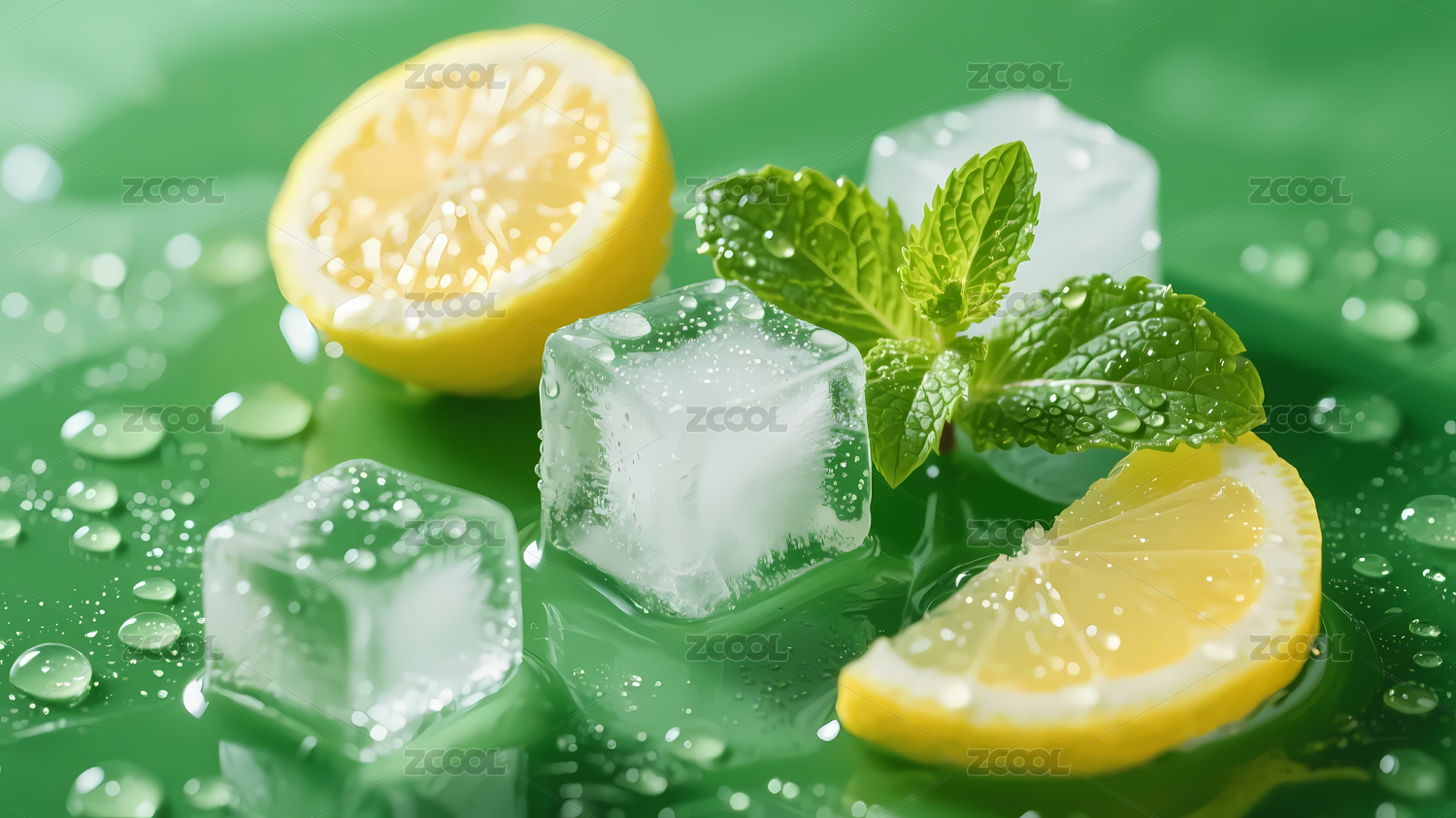 黄色,自然,冰块,清新,透明,浅蓝,水果,柠檬,绿叶,组合
