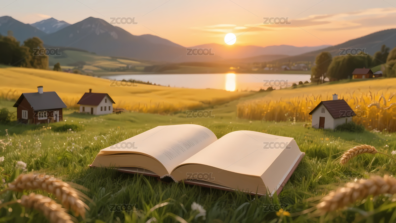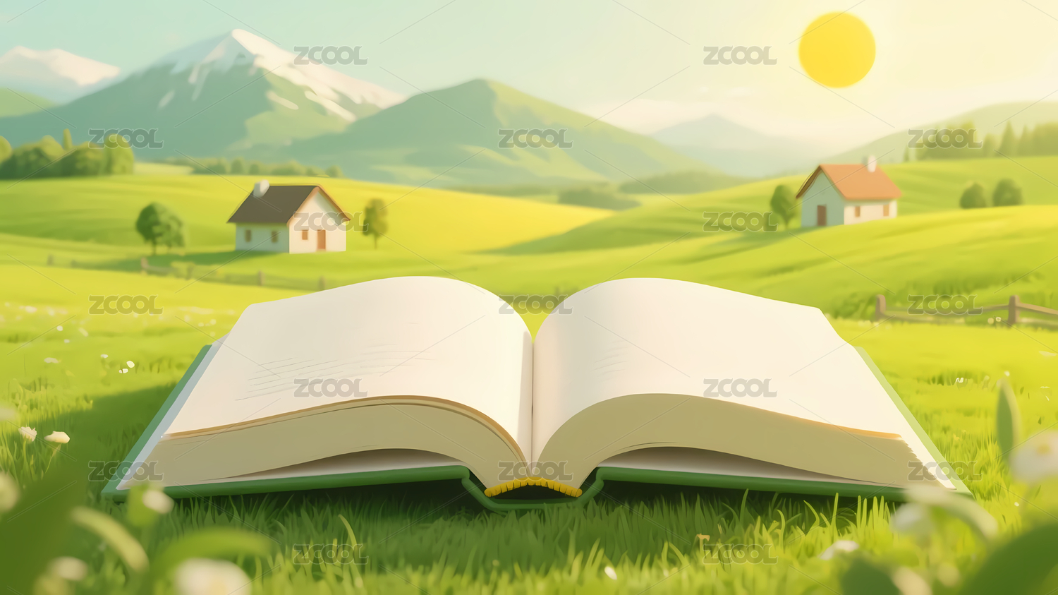 绿色,草地,黄色,书本,乡村,山丘,房子,花朵,太阳,和谐