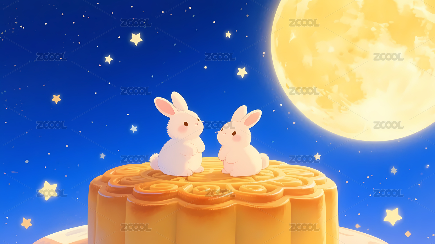 蓝色,黄色,兔子,月饼,满月,温馨,节日,祥和,动物,星空