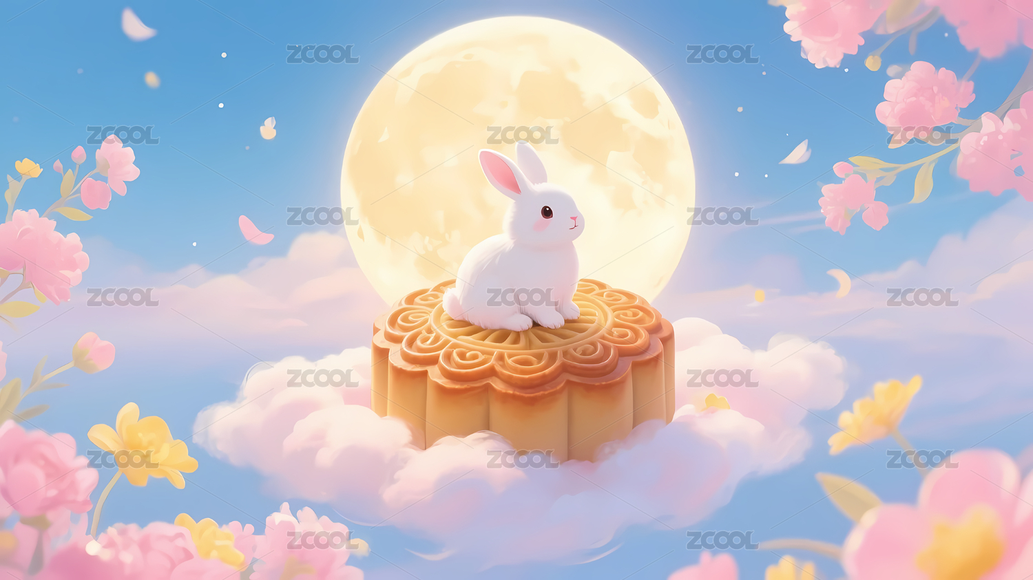 中秋节月亮下的月饼和玉兔插画背景壁纸