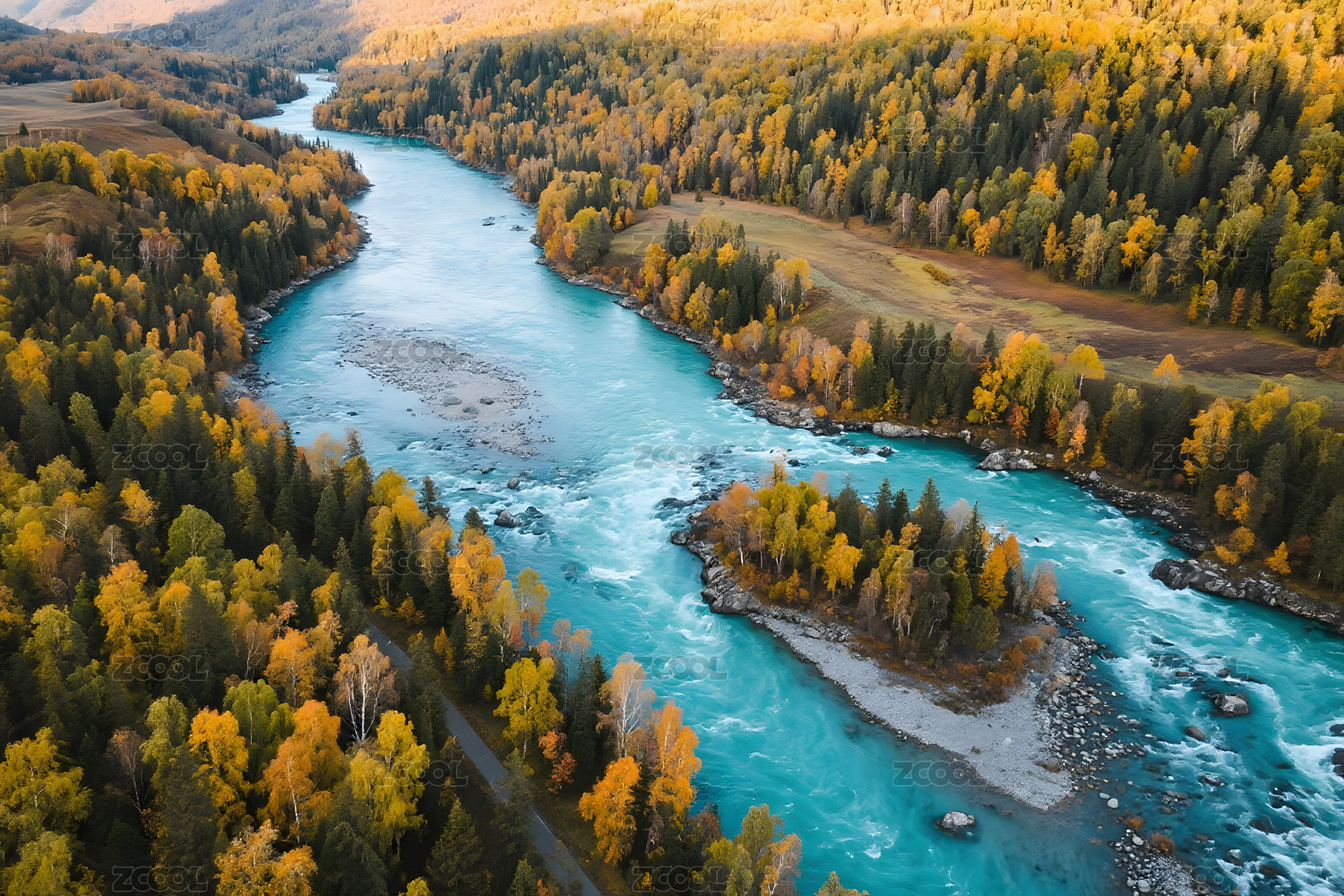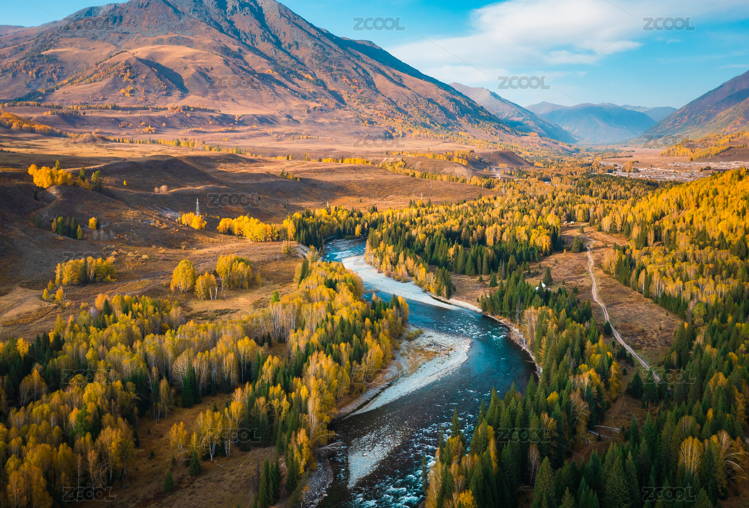 秋景,河流,山脉,森林,自然风光,金色,秋色,河谷,宁静,壮丽