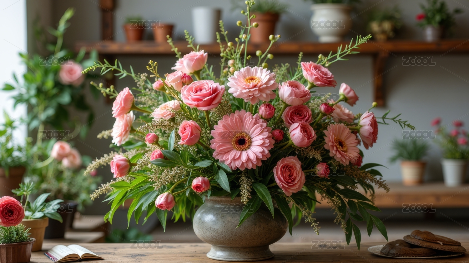 美丽盛开的鲜花玫瑰康乃馨插花与花瓶
