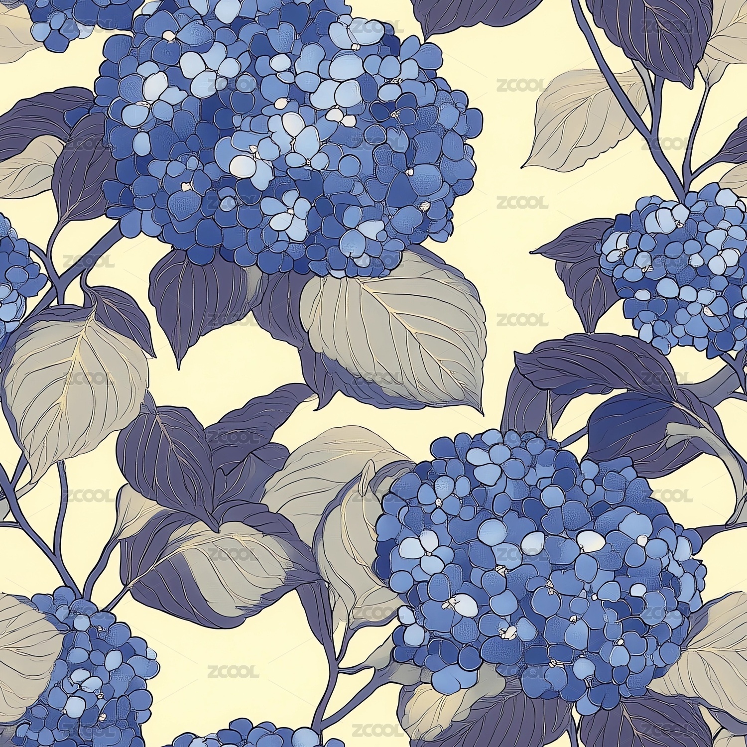 蓝底绣球花绿叶图案