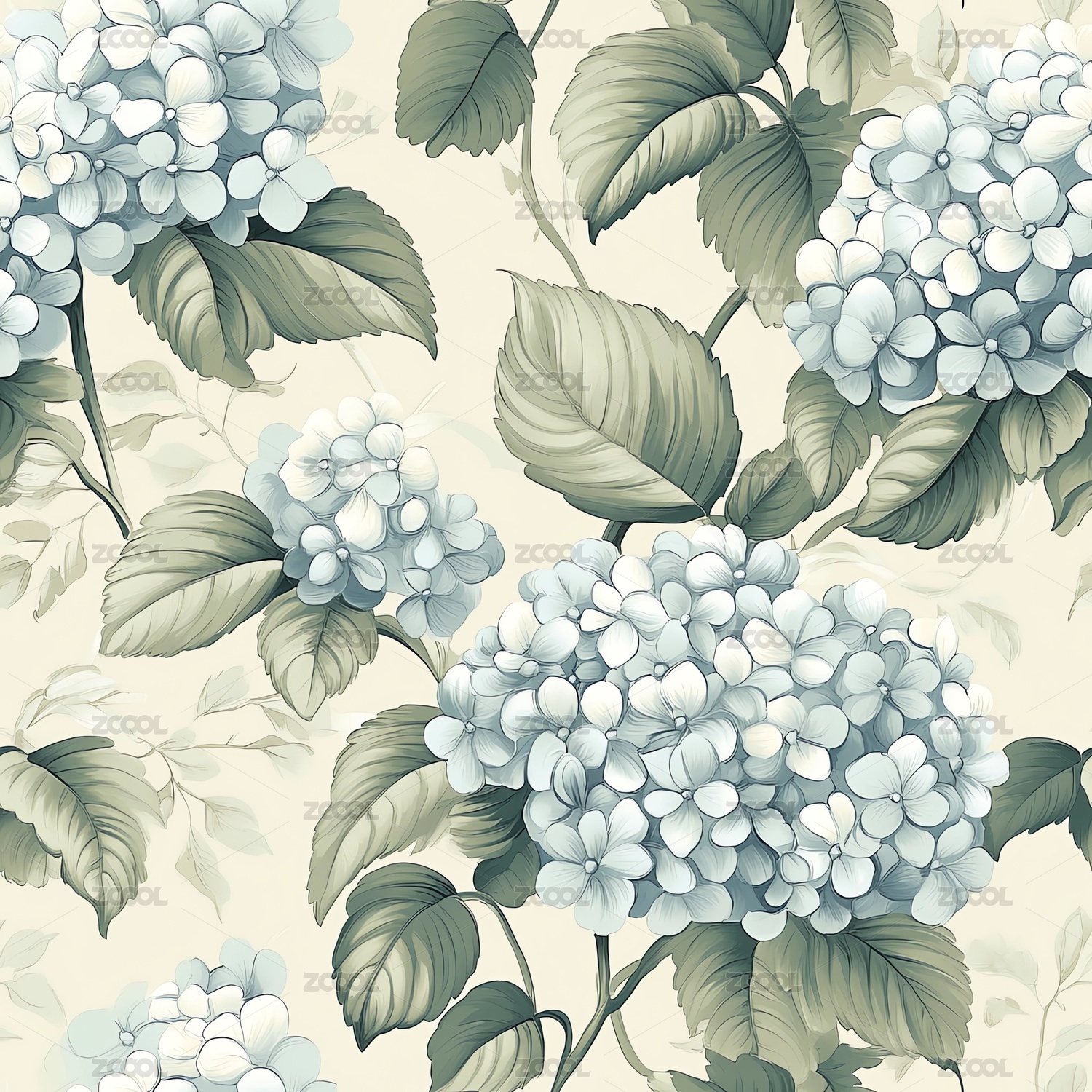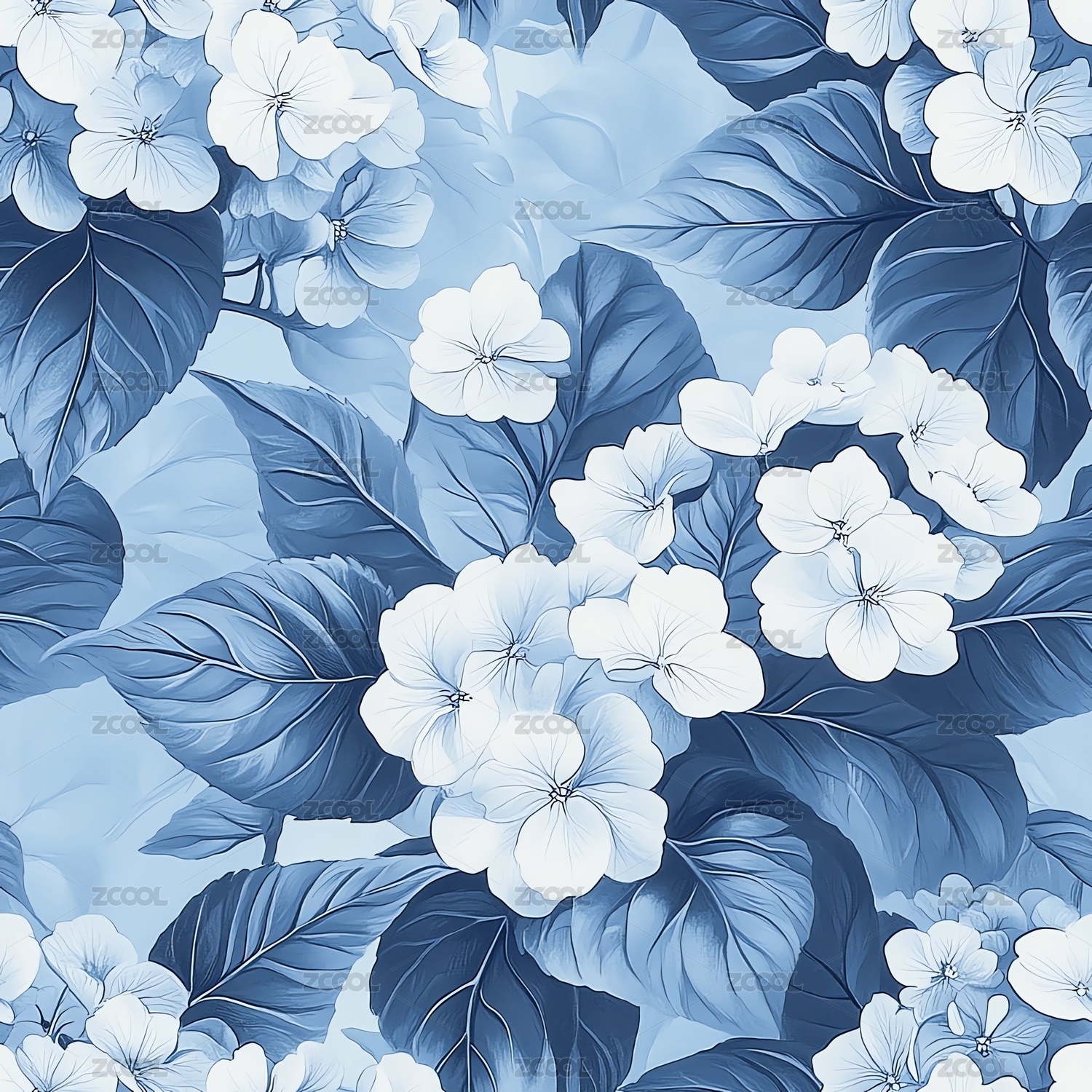 蓝白绣球花绿叶背景图案