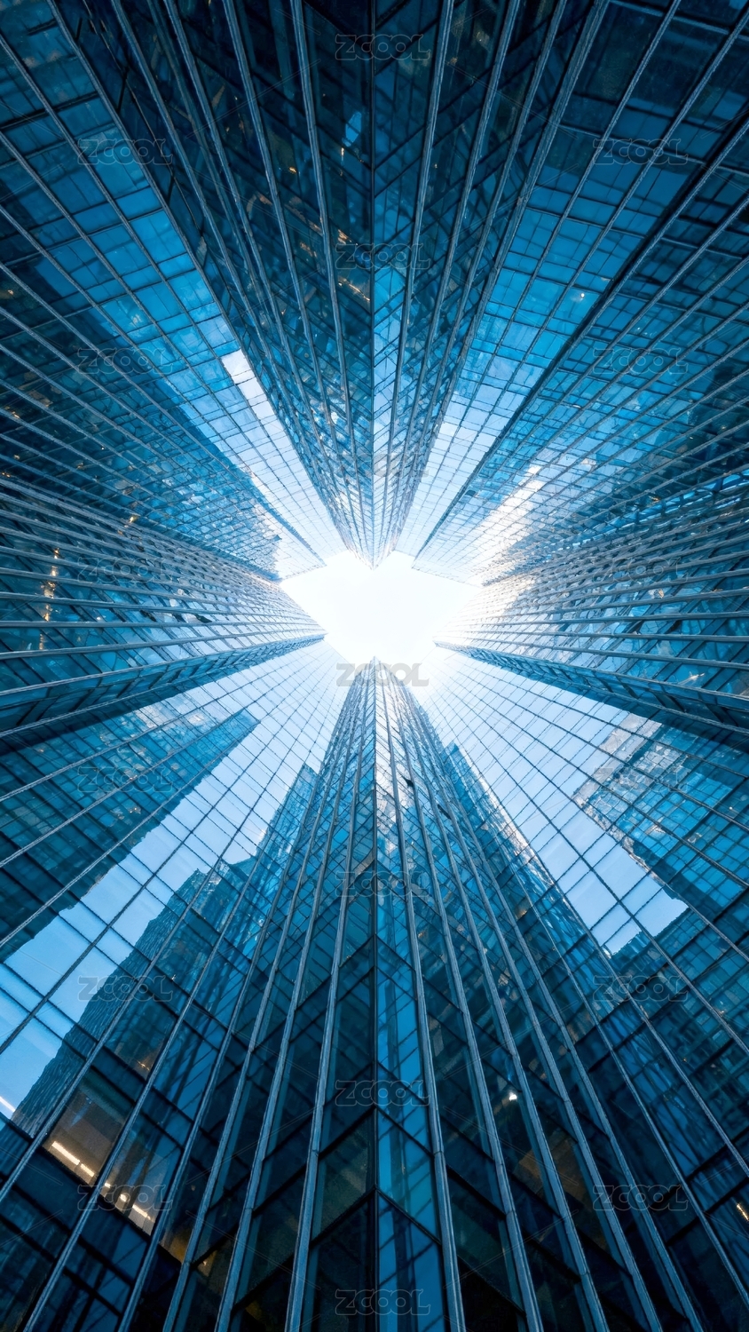 白天仰视彩色城市建筑摩天大楼3D立体插画