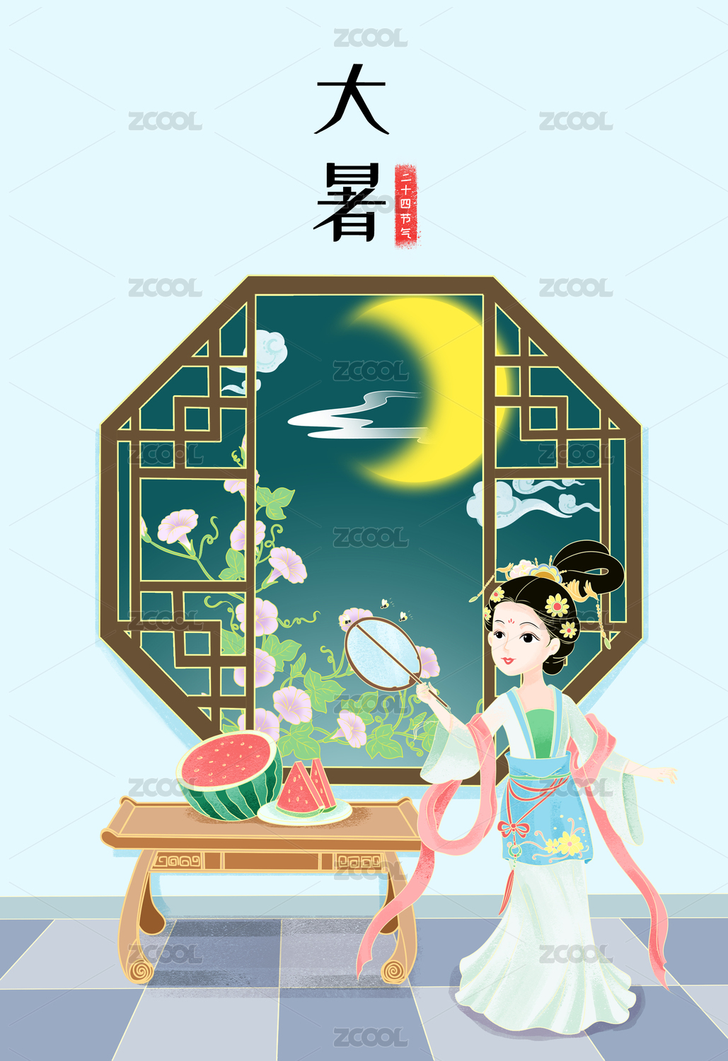 大暑二十四节气艺术字,一片西瓜,蓝色背景