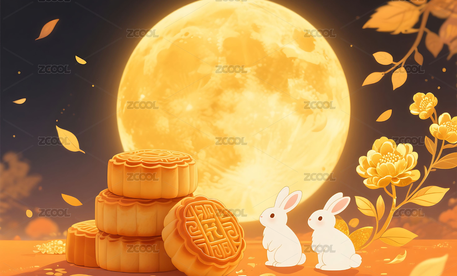 中秋节月亮下的月饼和玉兔插画背景壁纸
