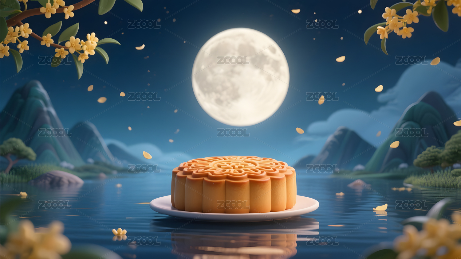 主视觉,月饼,国潮,中秋,场景,月亮,山水,传统,节日,糕点