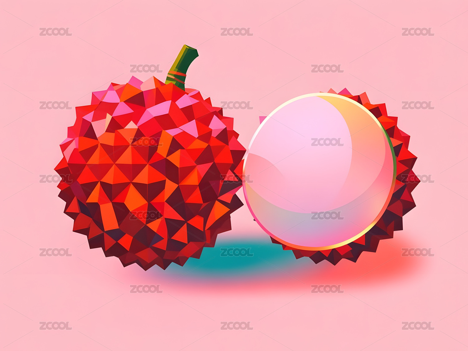 荔枝,水果,复古,插画,设计,趣味,像素风格,红壳,绿柄绿叶,方块造型