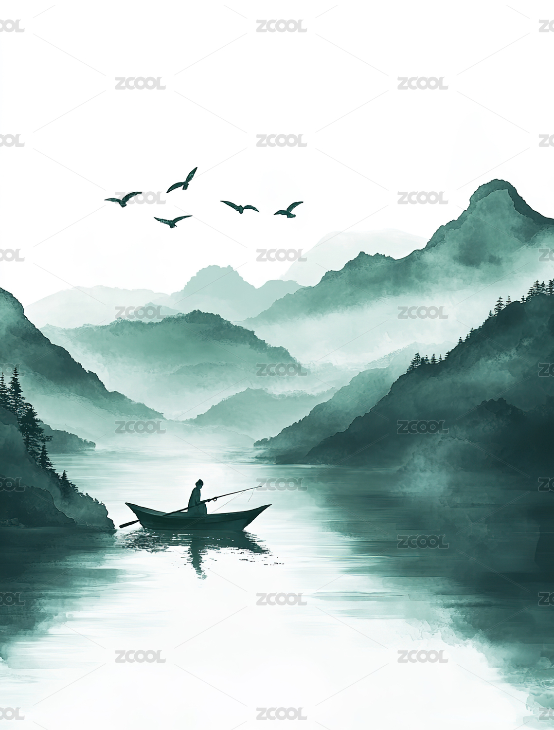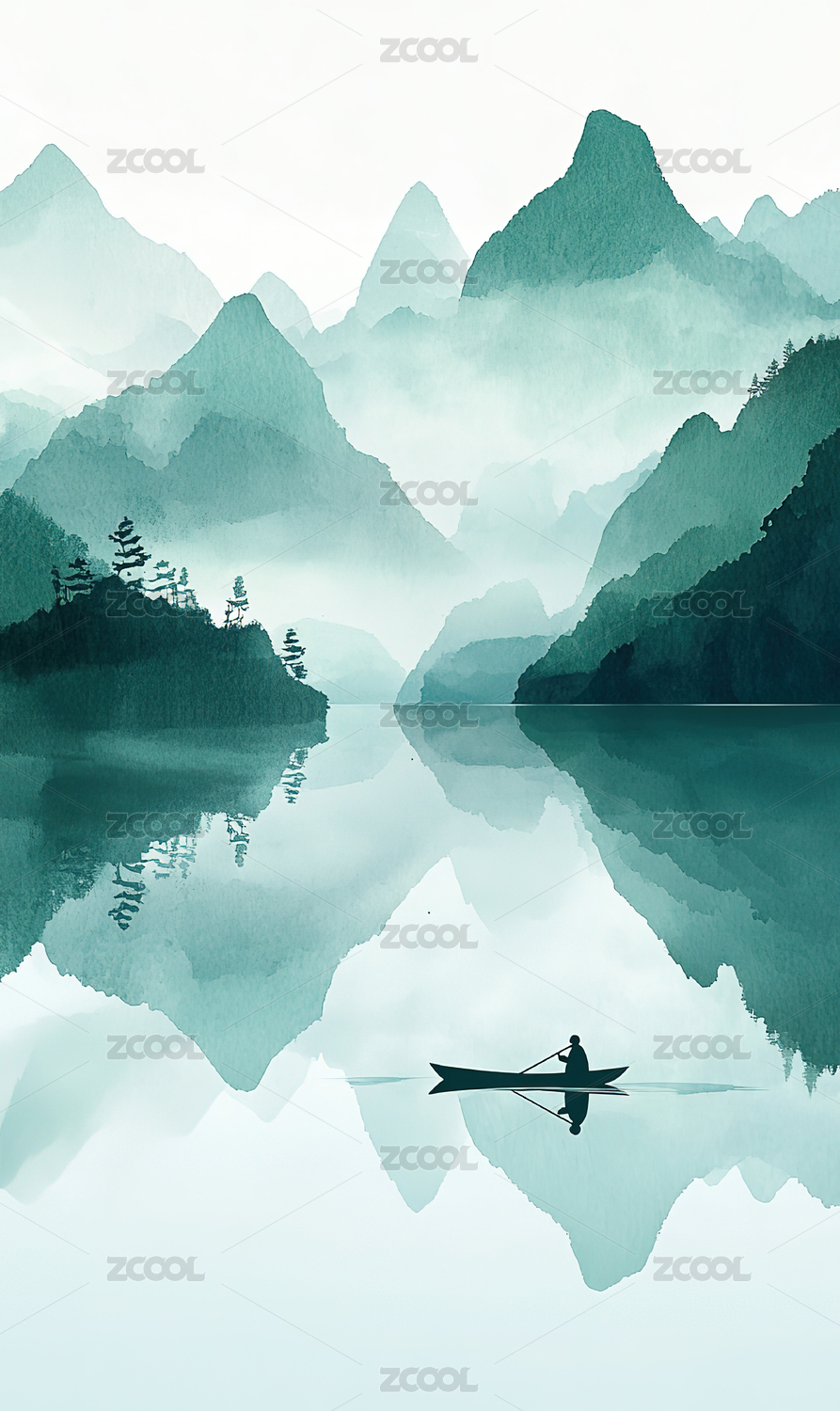 水墨山水,雾气朦胧,孤舟独行,宁静致远