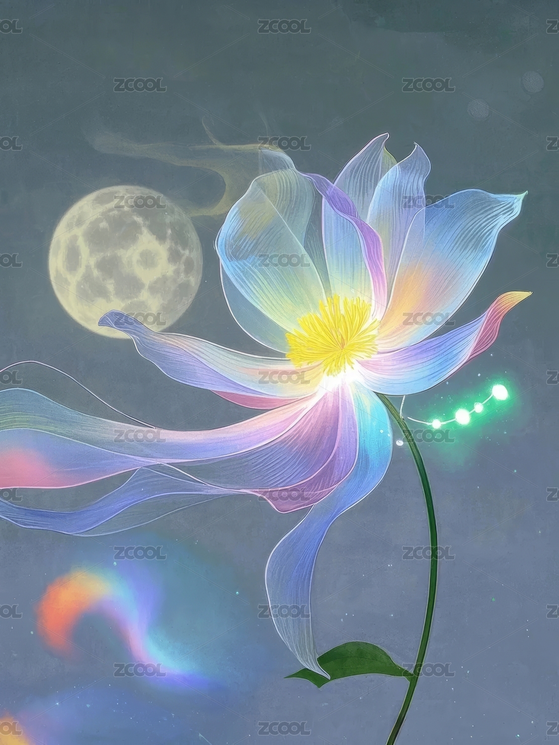 月夜荷塘盛放莲花 唯美浪漫水彩夜景