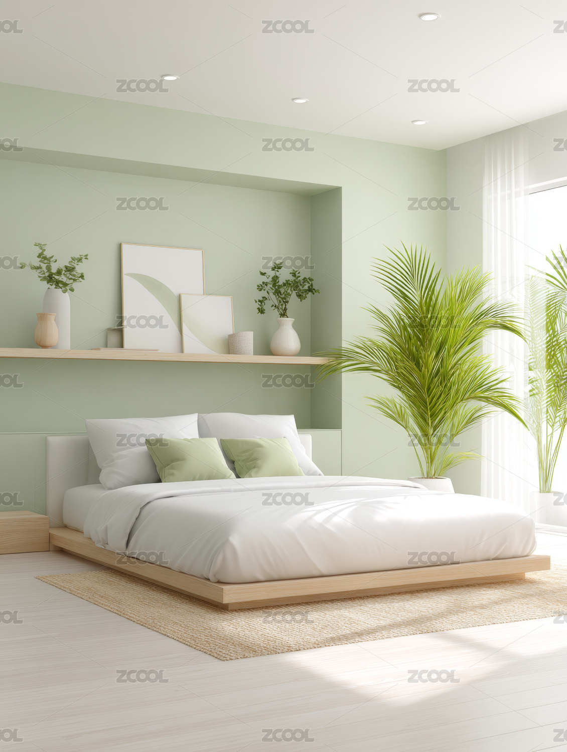 卧室,绿色,植物,床,窗户,装饰画,灯,地毯,现代,简约