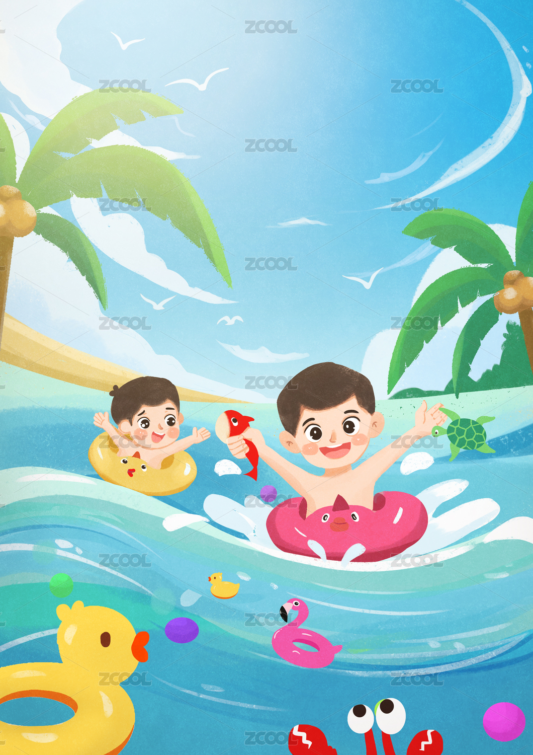 暑假小孩游泳儿童节泳池度假运动场景插图