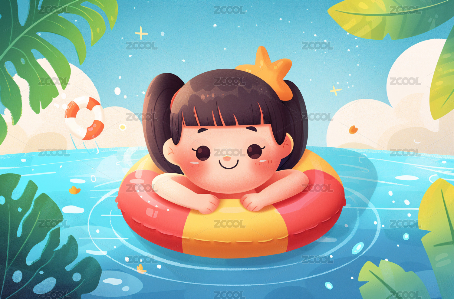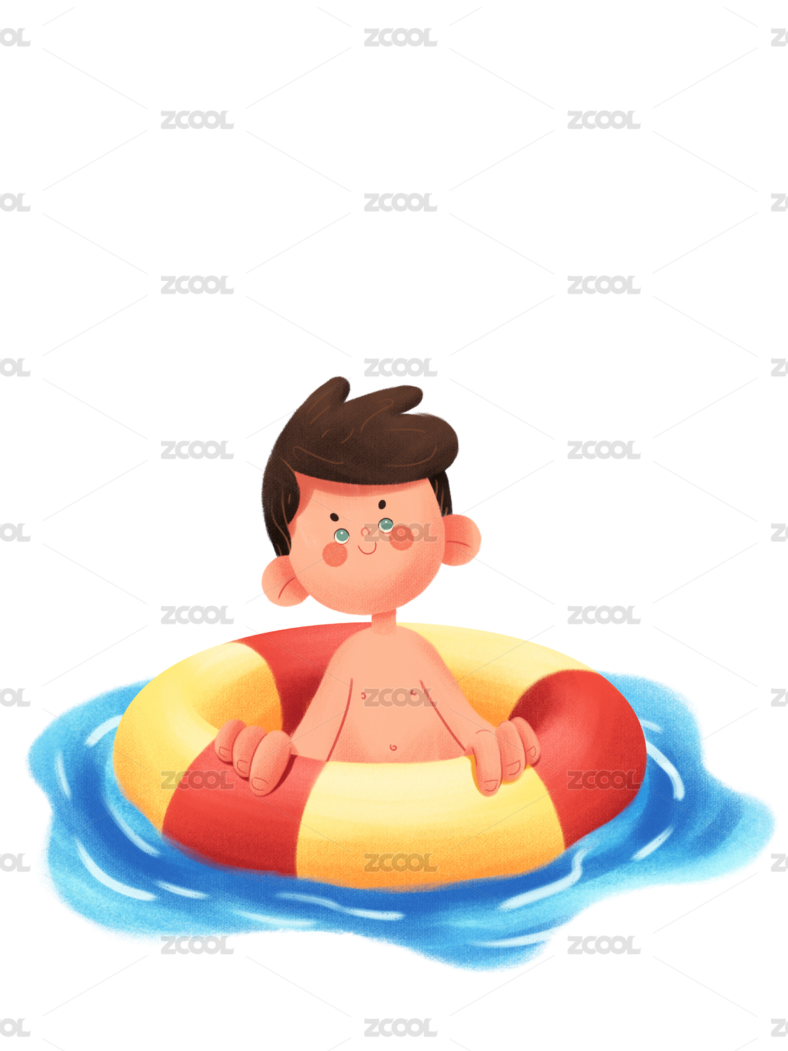 小男孩夏天戴救生圈游泳清凉手绘卡通儿童插画设计