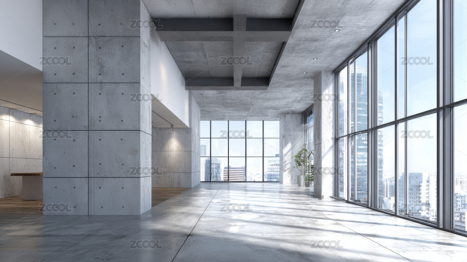 全景玻璃墙空旷空间外映城市绿景