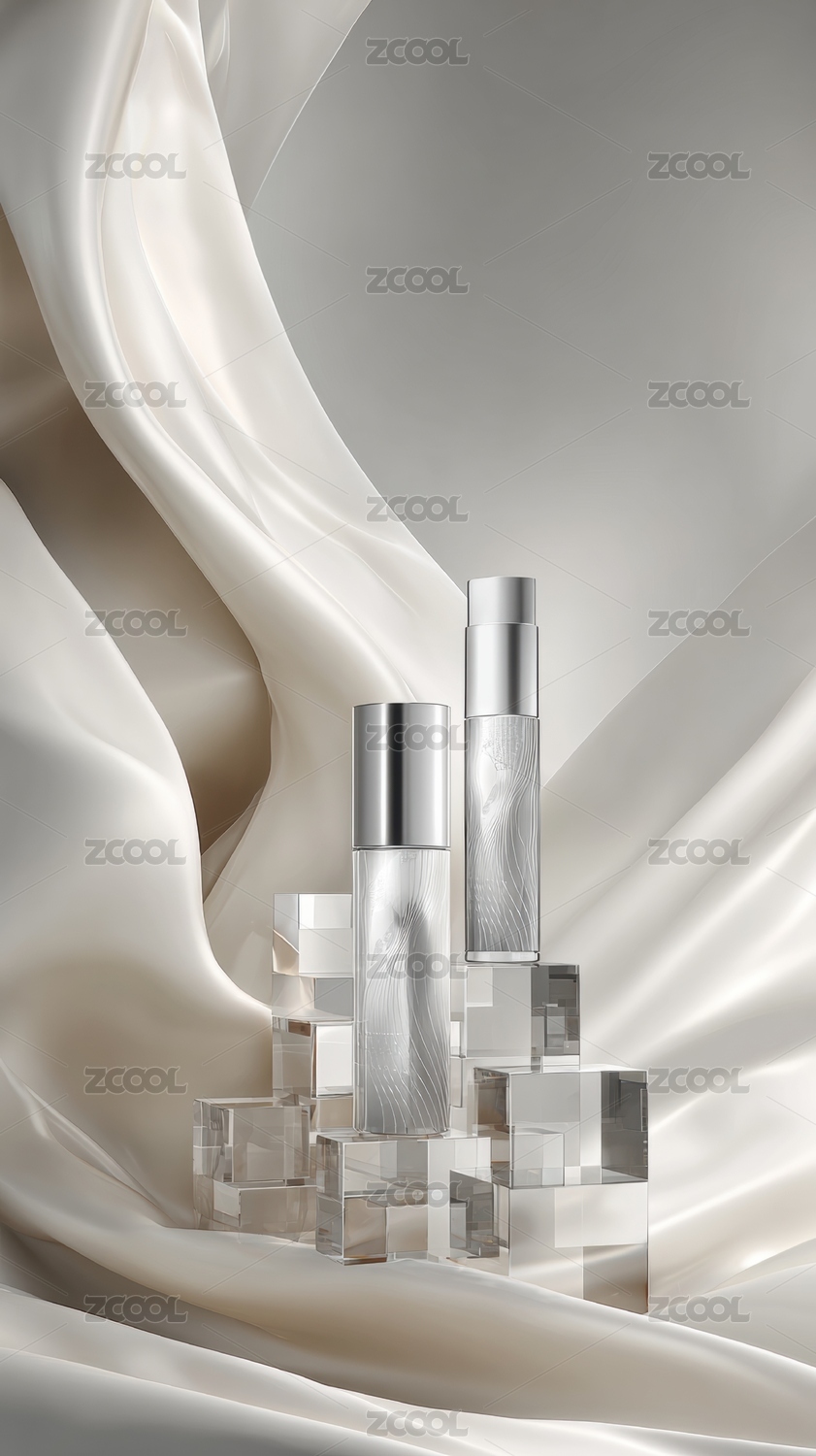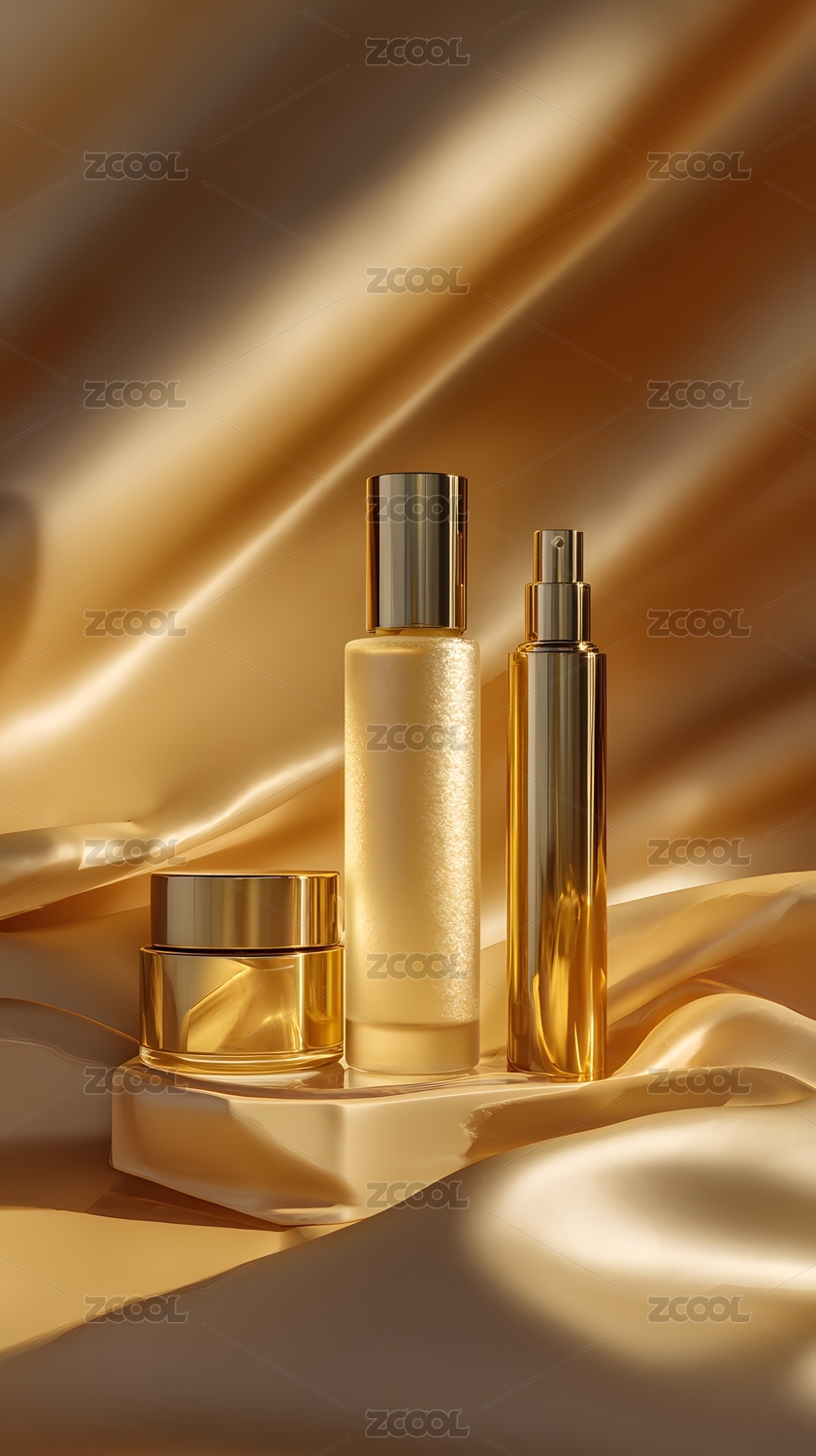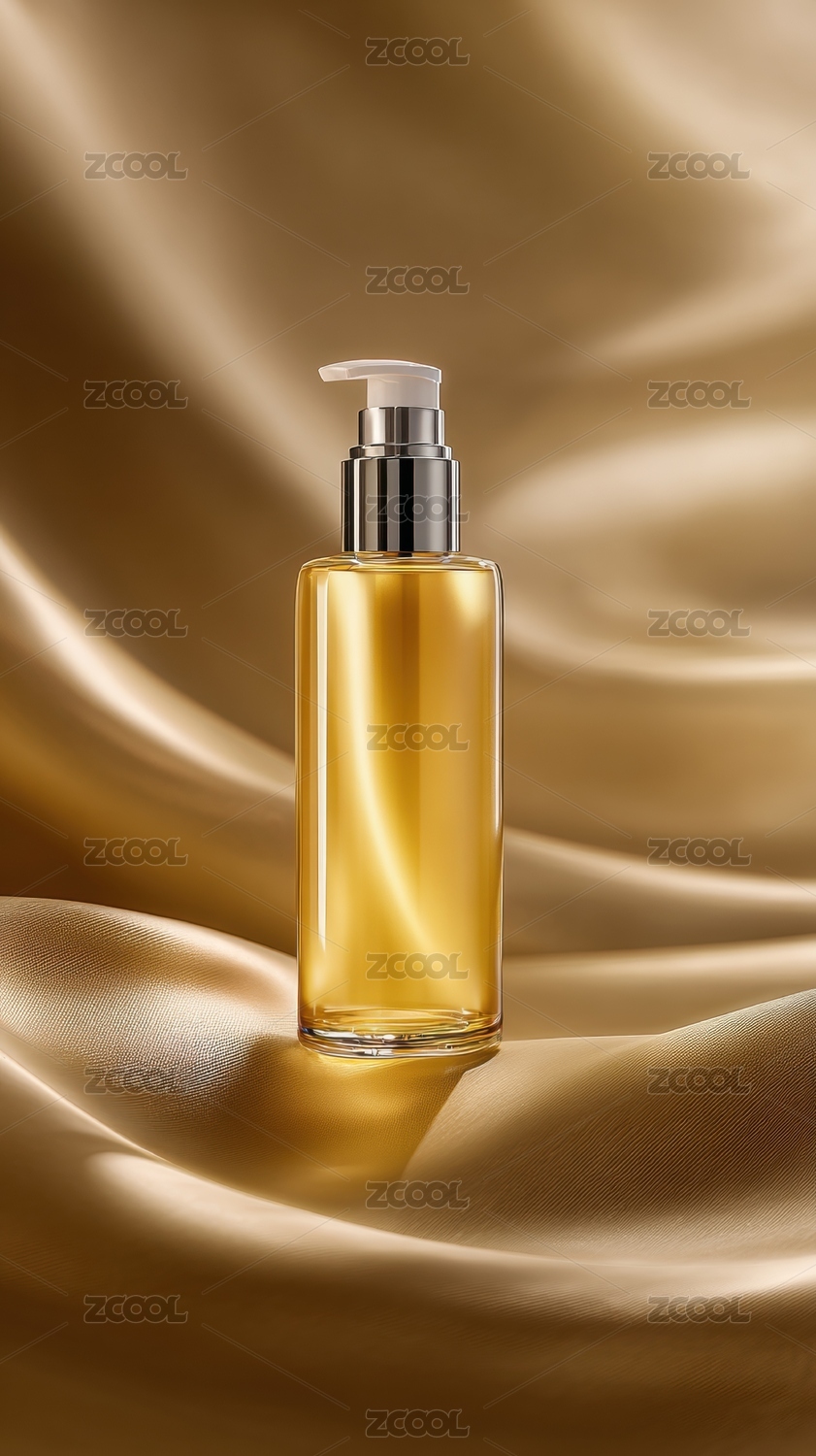护肤品,金色瓶子,柔和光线,布料背景,美容产品,高端设计,光滑质感,现代简约,奢华感,容器