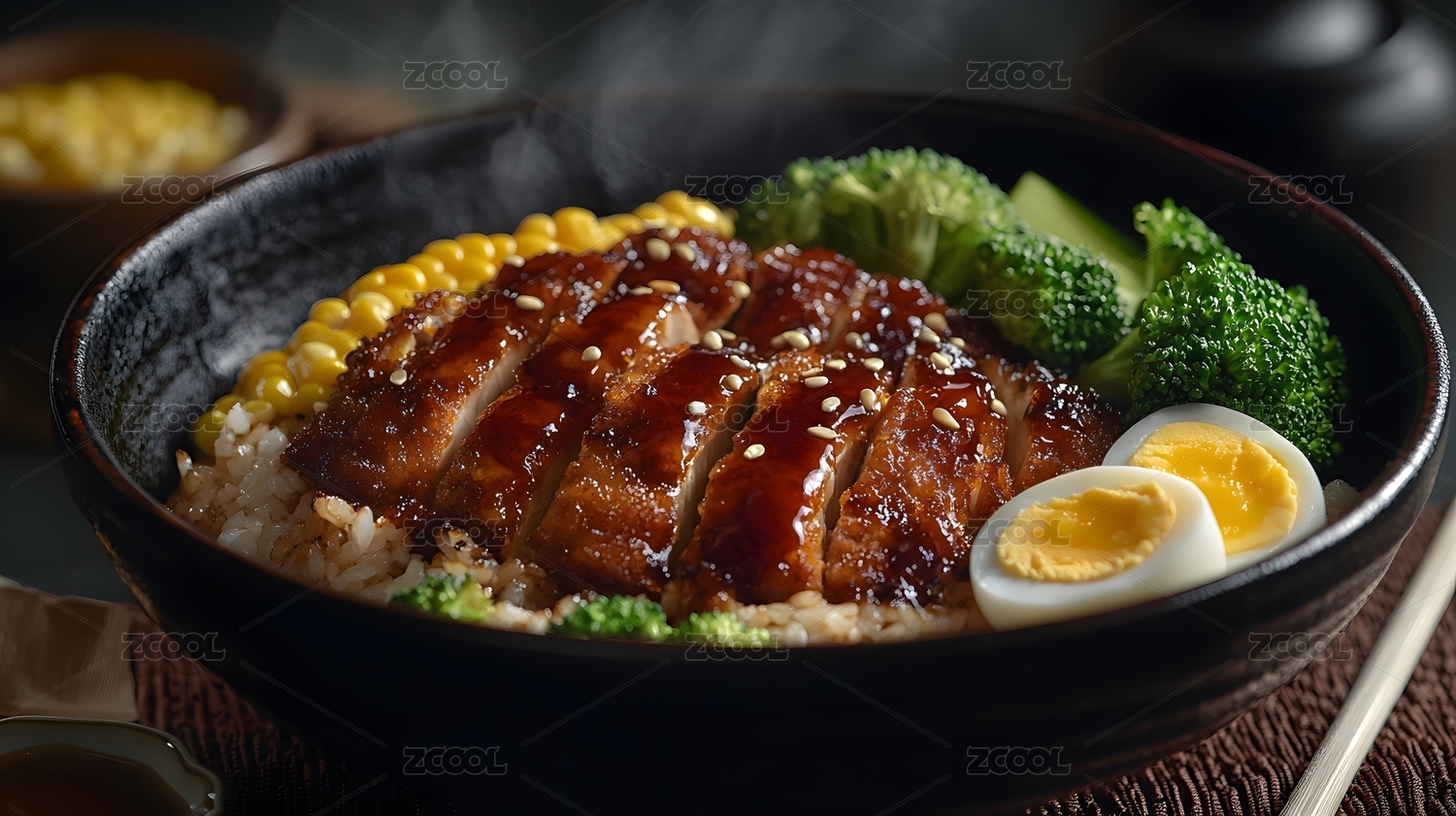 室内,鸡肉,米饭,西兰花,玉米,热气,碗装,美食,日式,料理