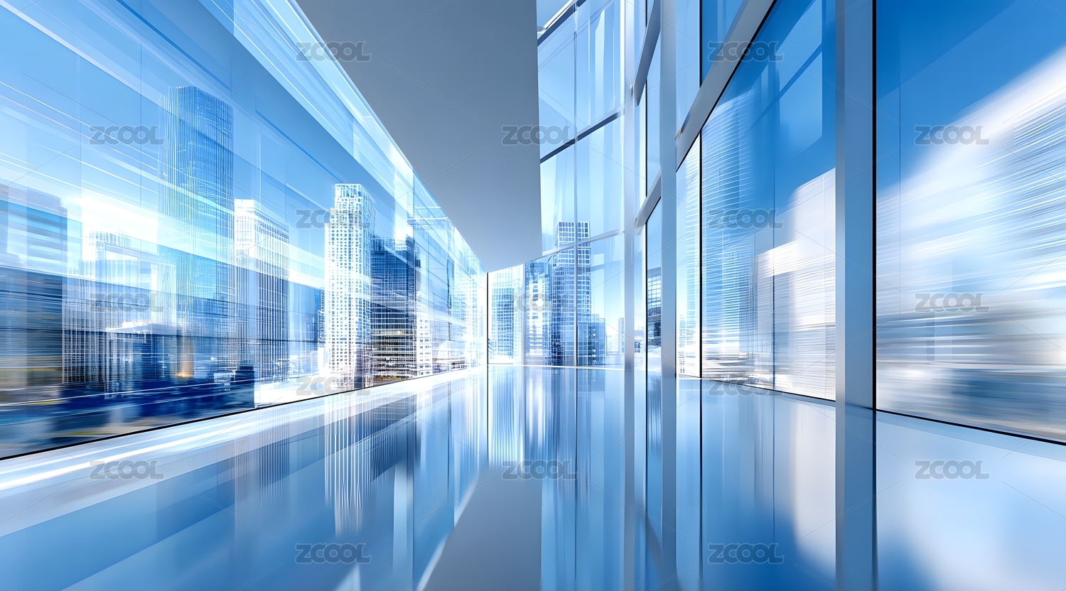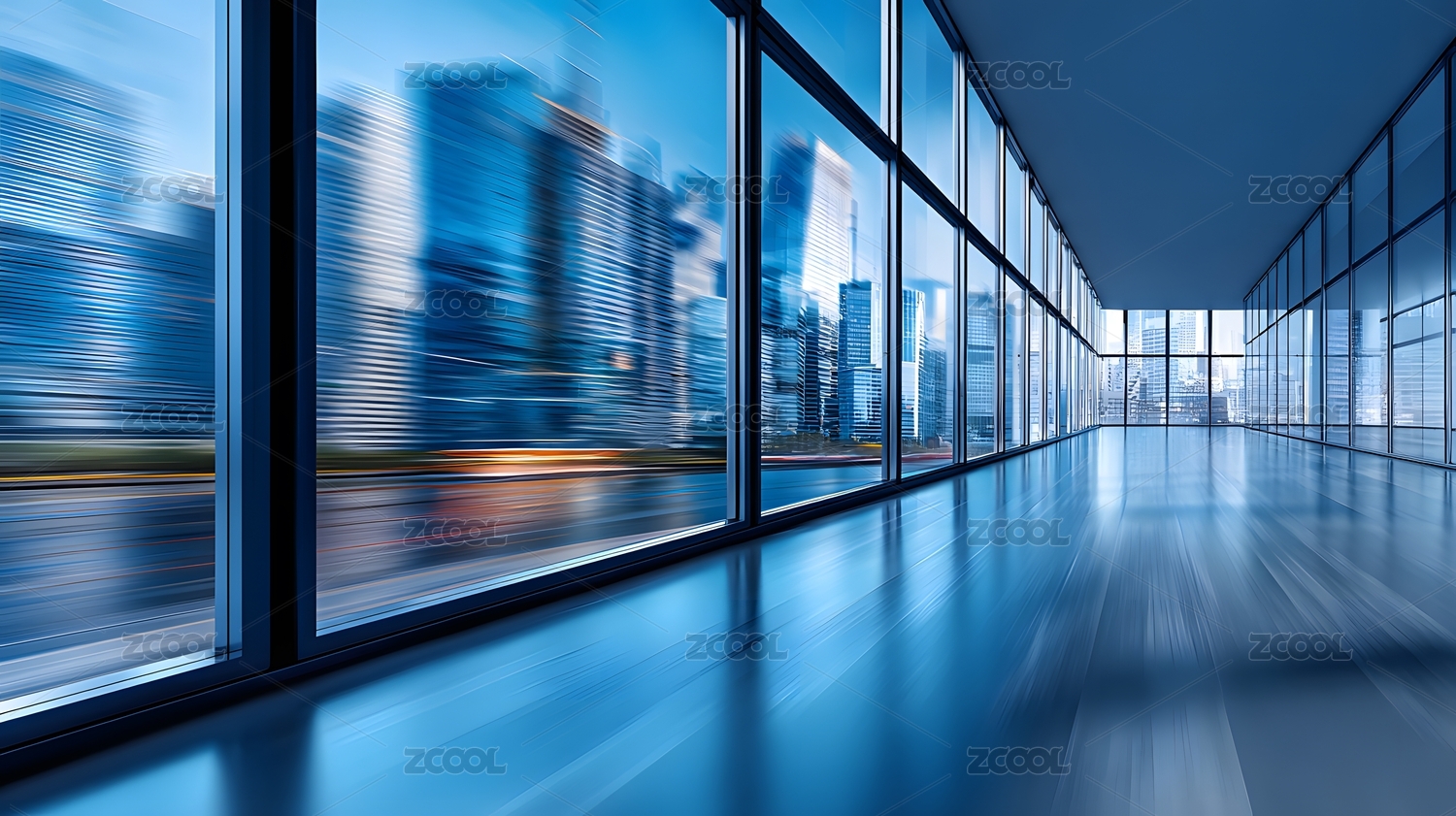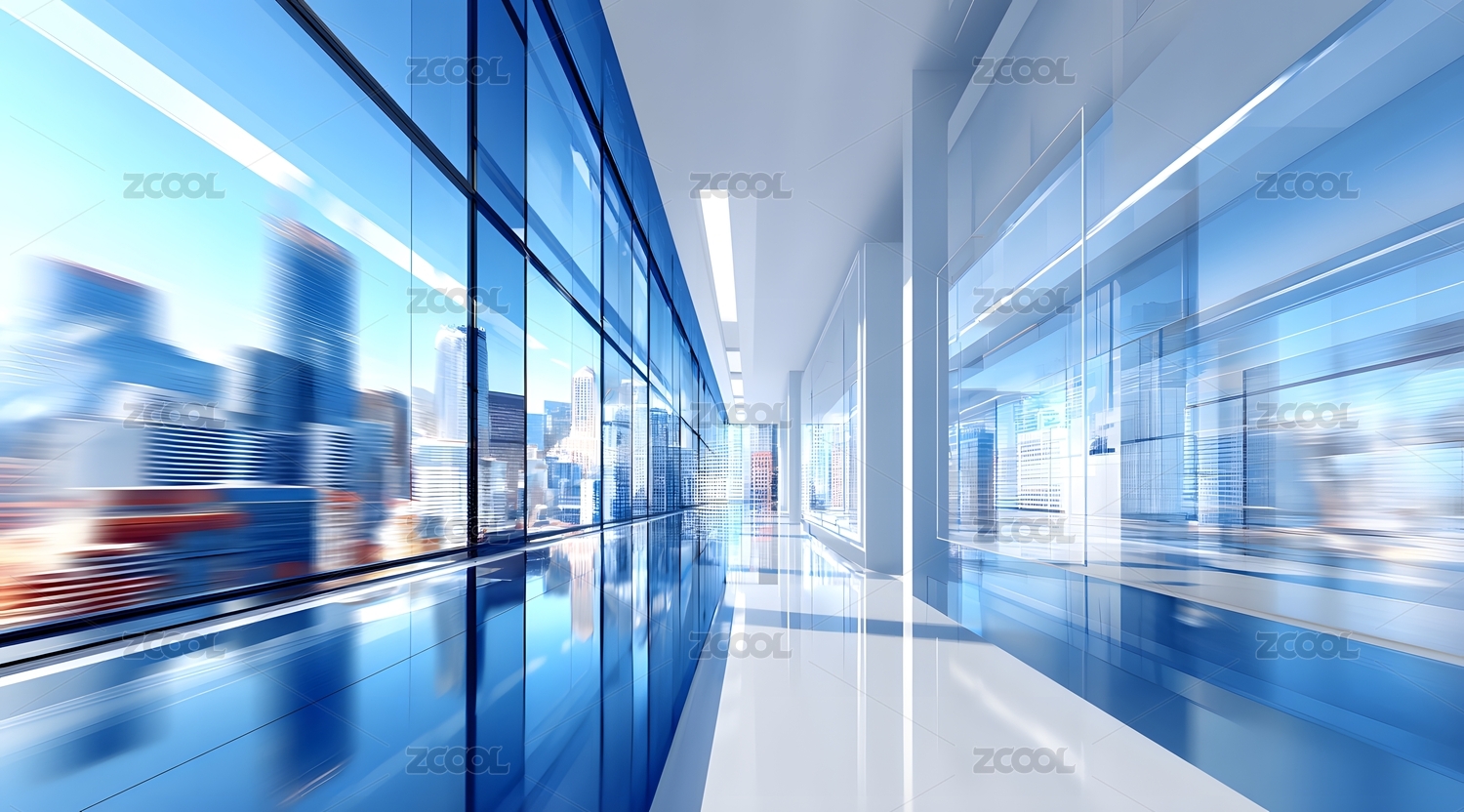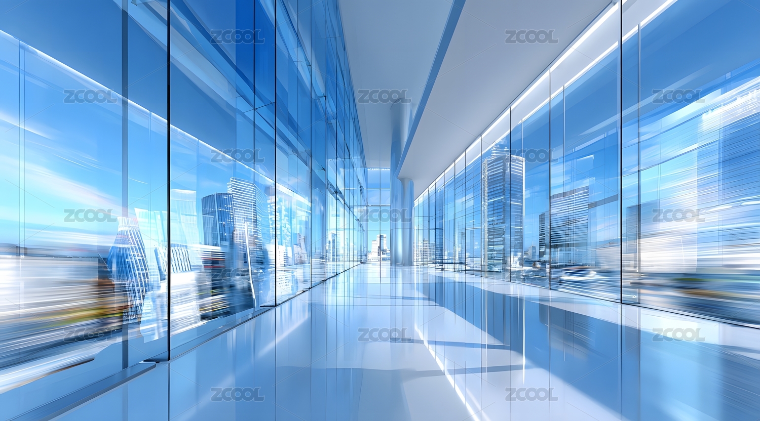玻璃幕墙,高楼大厦,宽敞走廊,明亮光线,城市景观,反射地板,现代化设计,商务环境,透明窗户,未来感