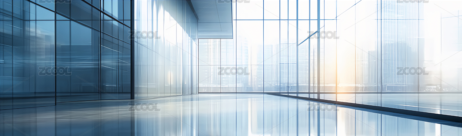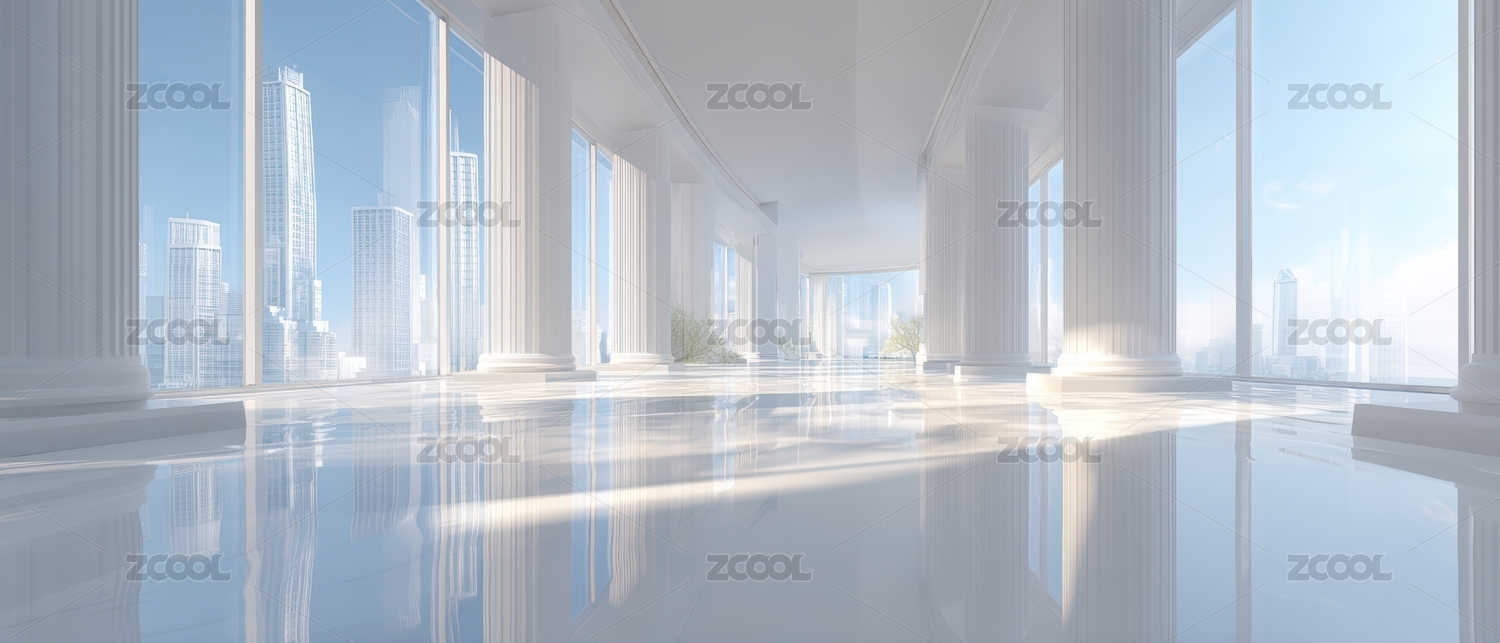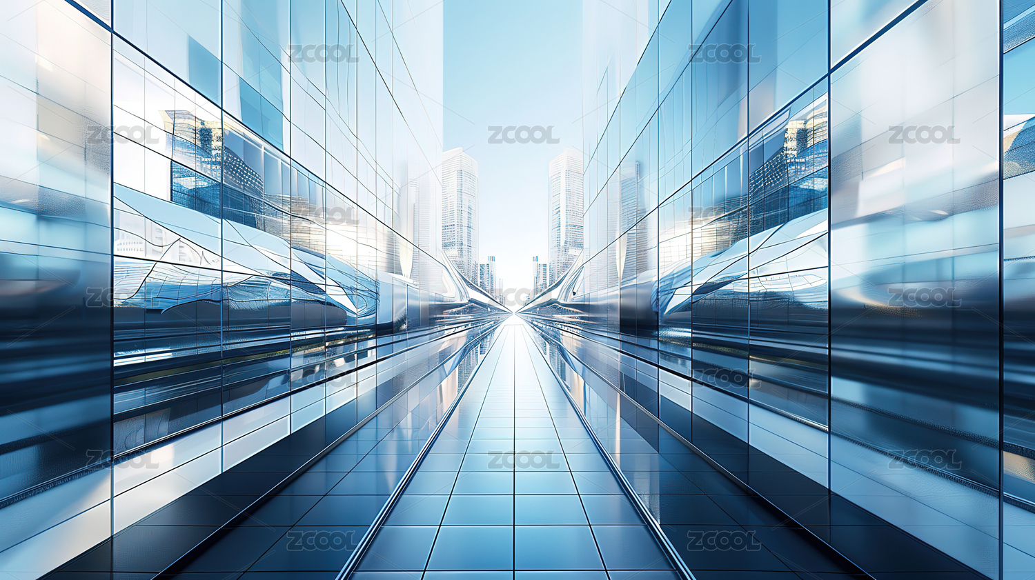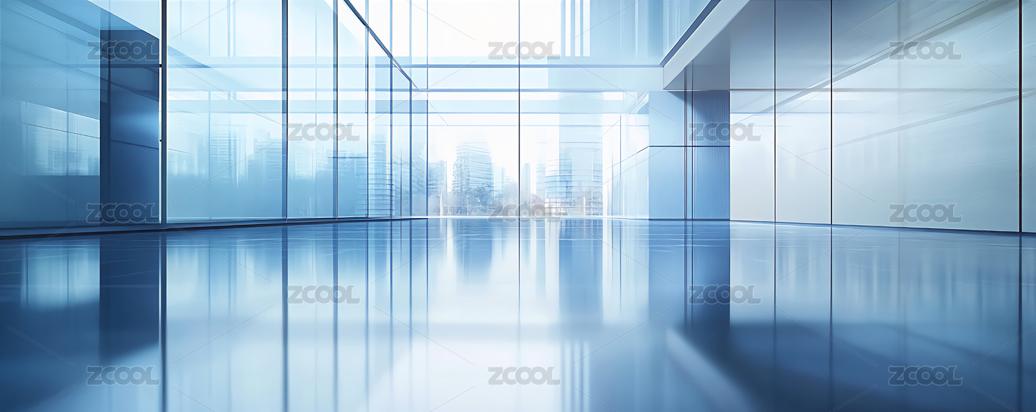 玻璃幕墙,高楼大厦,宽敞走廊,明亮光线,城市景观,反射地板,现代化设计,商务环境,透明窗户,未来感