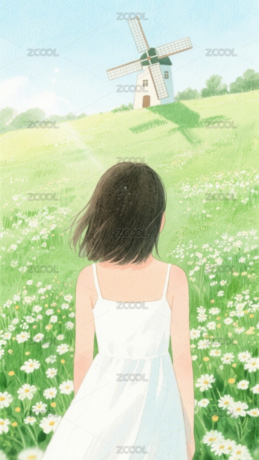 花田中的女孩与风车