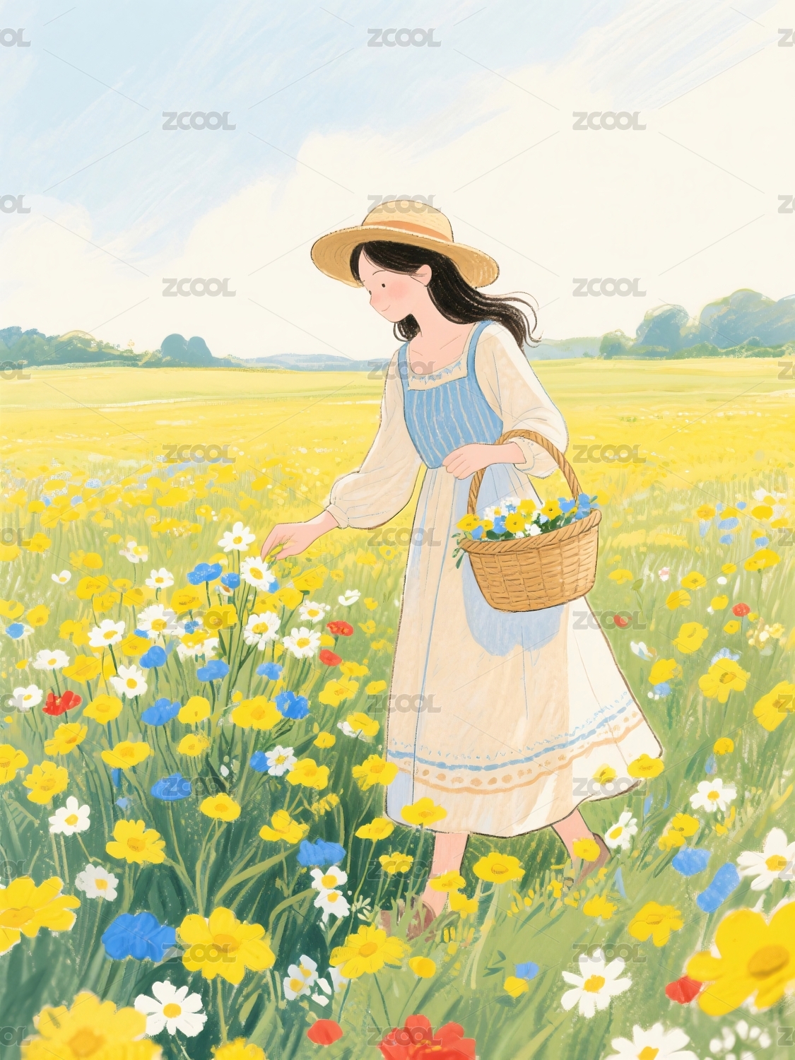 田园女孩水彩花海漫步场景