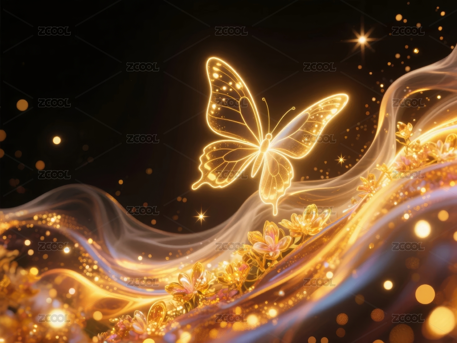 金色蝴蝶翩翩起舞周围环绕着光芒与花朵
