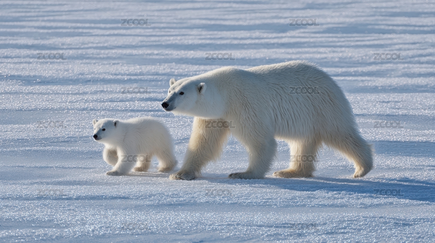 北极熊母子在雪地上行走