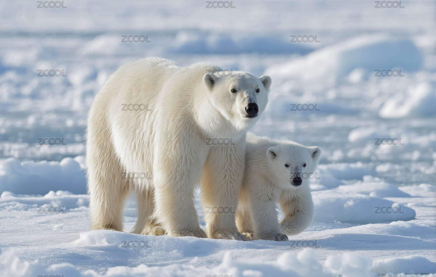 北极熊母子在冰雪中漫步