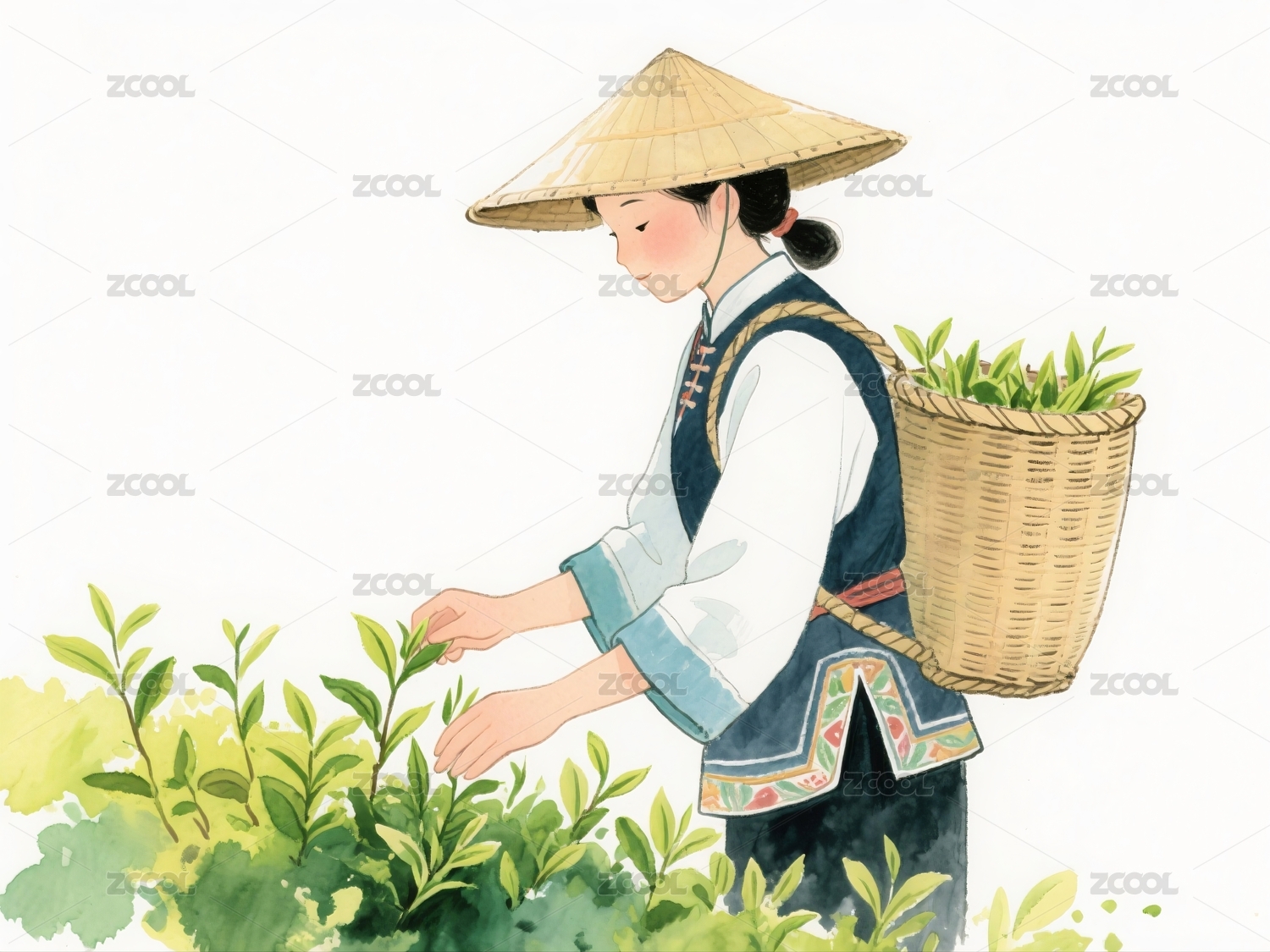 插画中女子茶园采茶场景