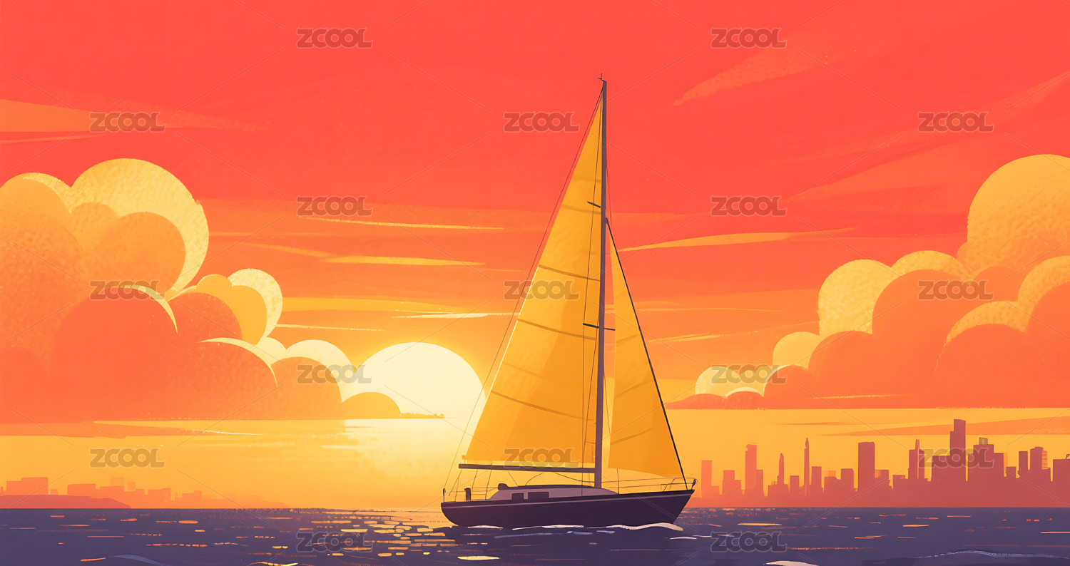 海上黄昏帆船插画