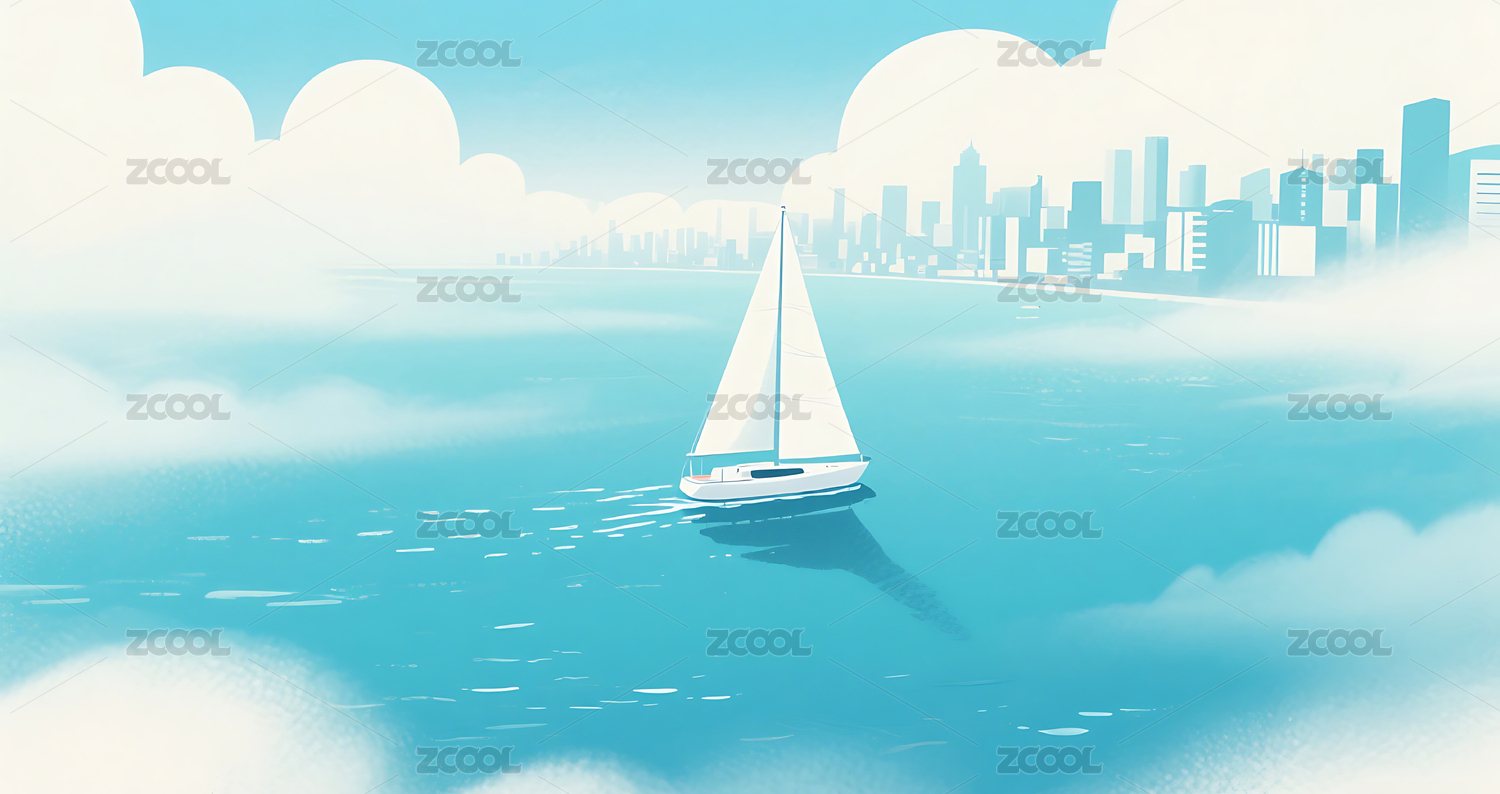 卡通,插画,海上,大海,帆船,城市,建筑,天空,白云,背景