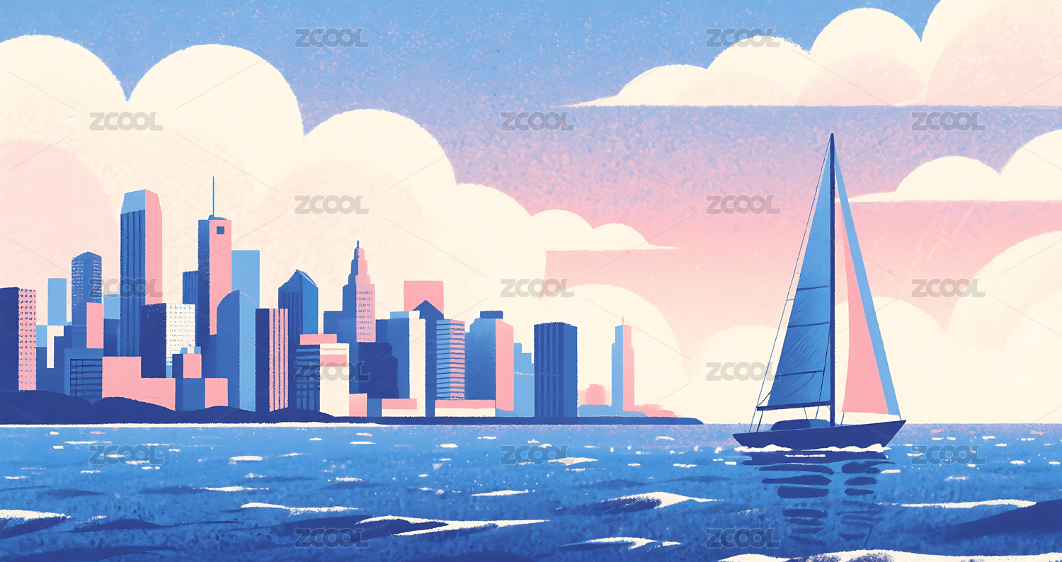 大海和城市风景插画