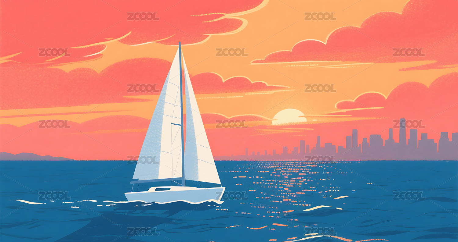 卡通,插画,海上,大海,帆船,城市,建筑,天空,白云,背景