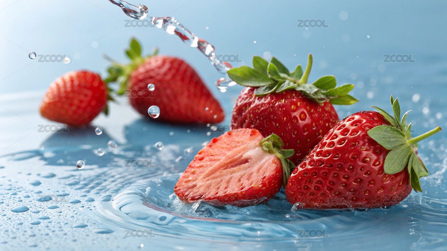 鲜红草莓浅蓝水花飞溅