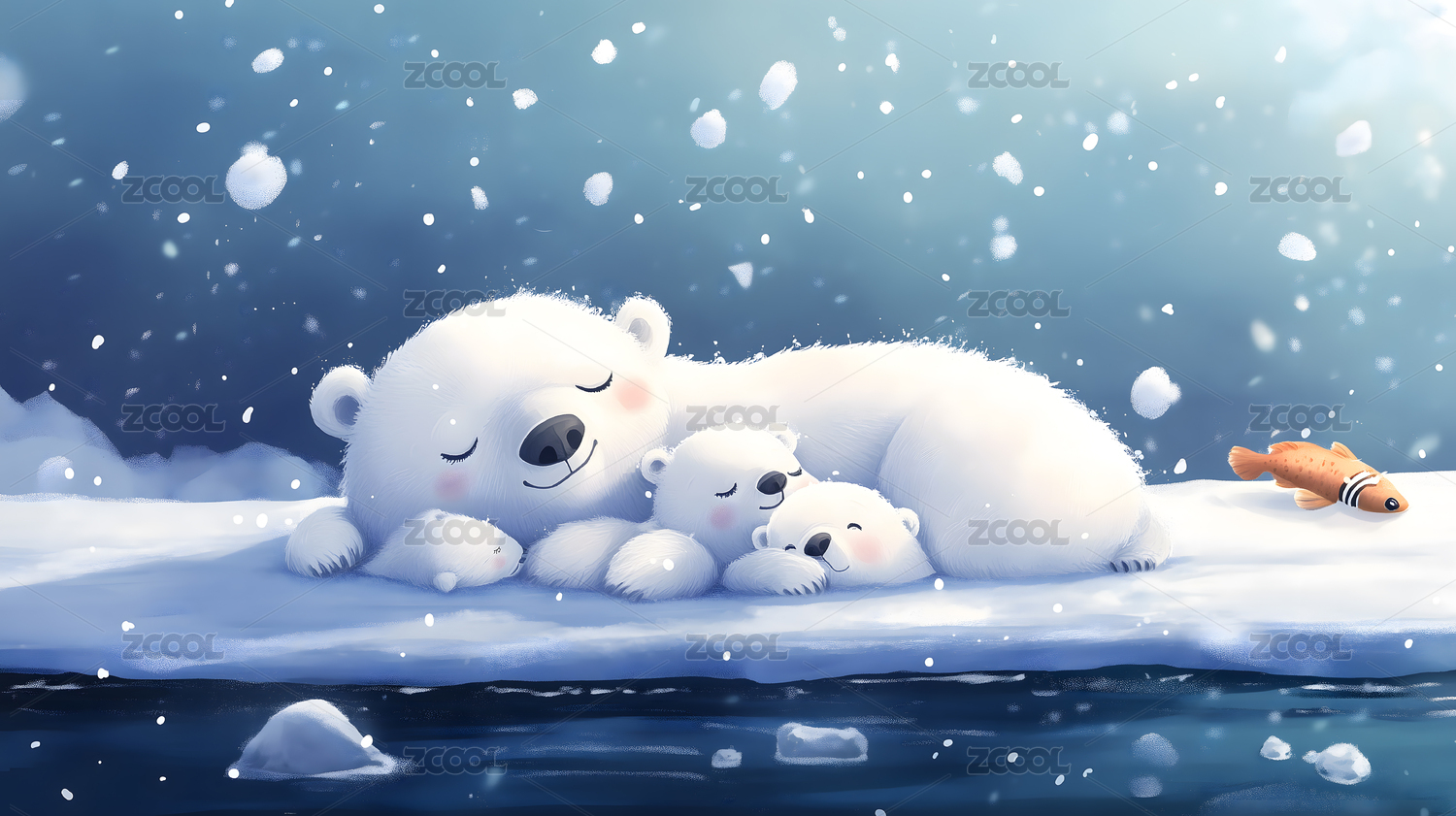北极熊一家在雪地里