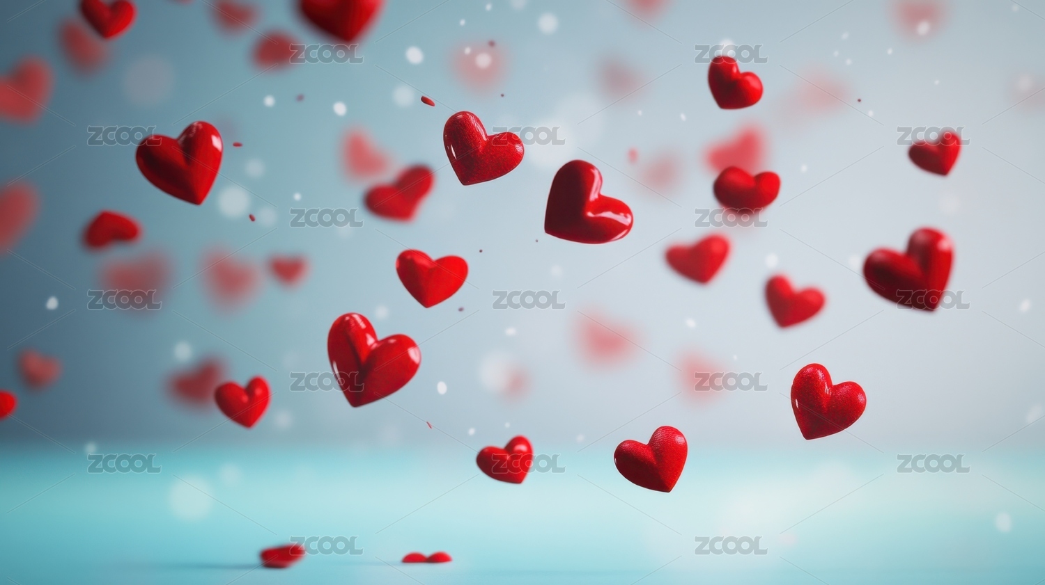 红色心形漂浮在浅蓝色背景上
