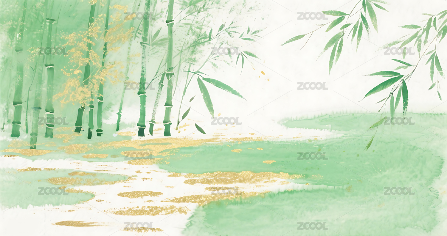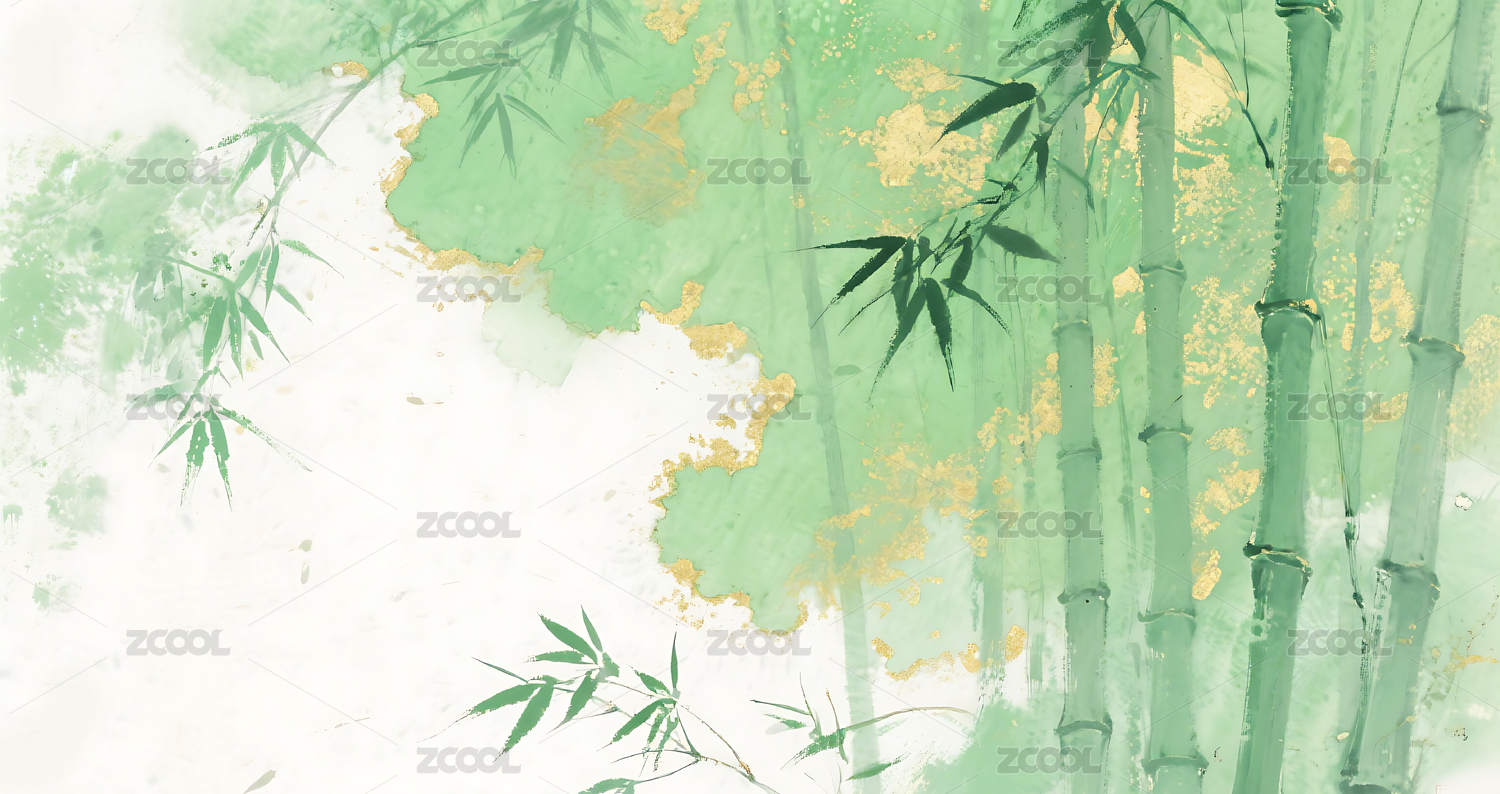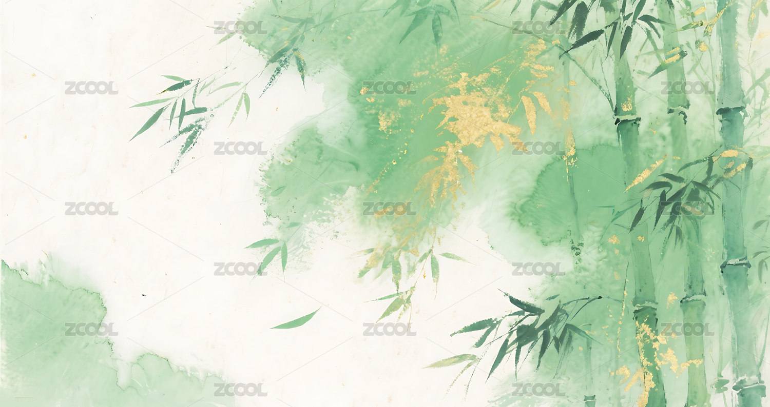 绿色,金色,竹叶,竹林,插画,背景,壁纸,晕染,水墨,中式