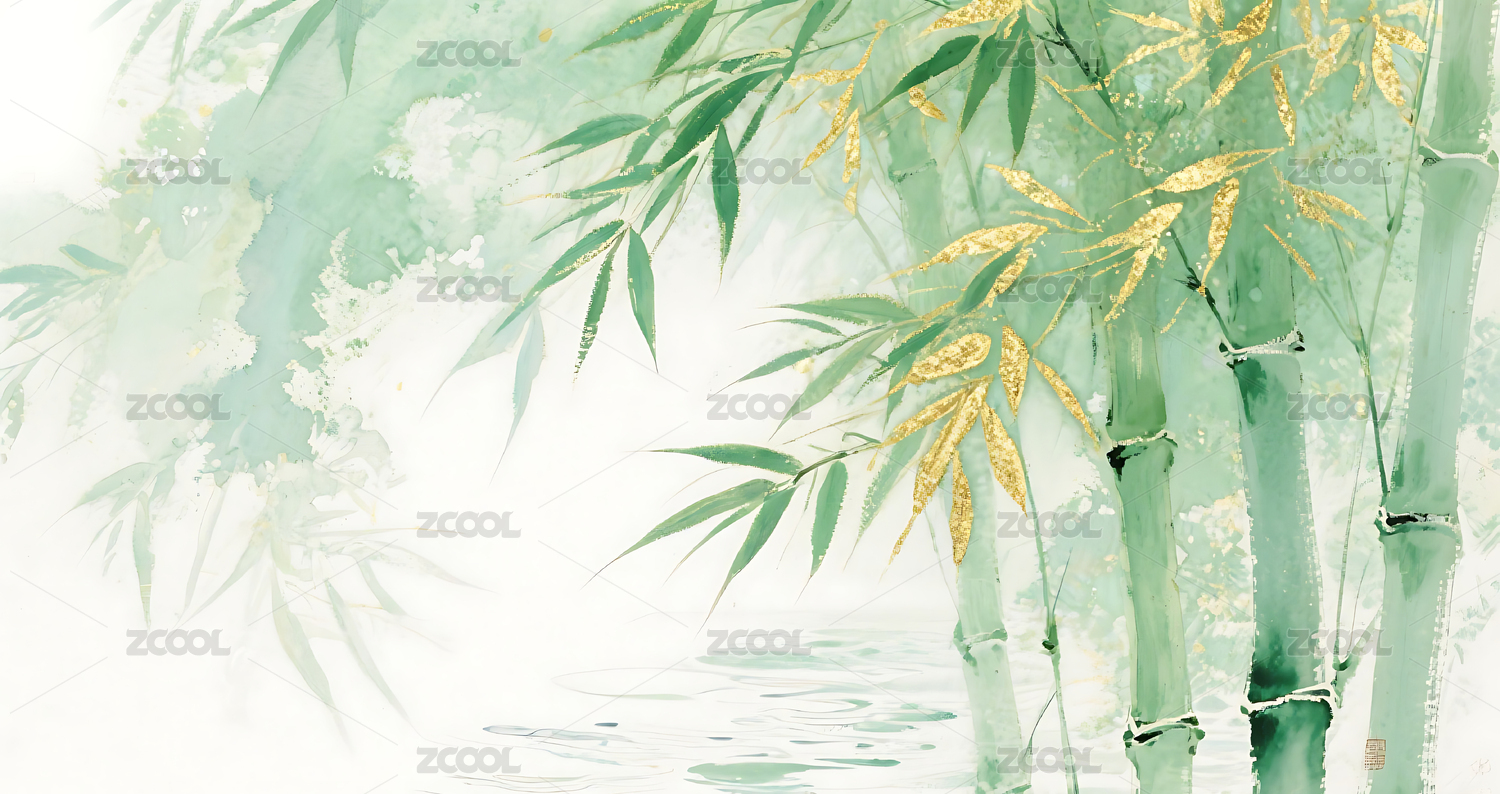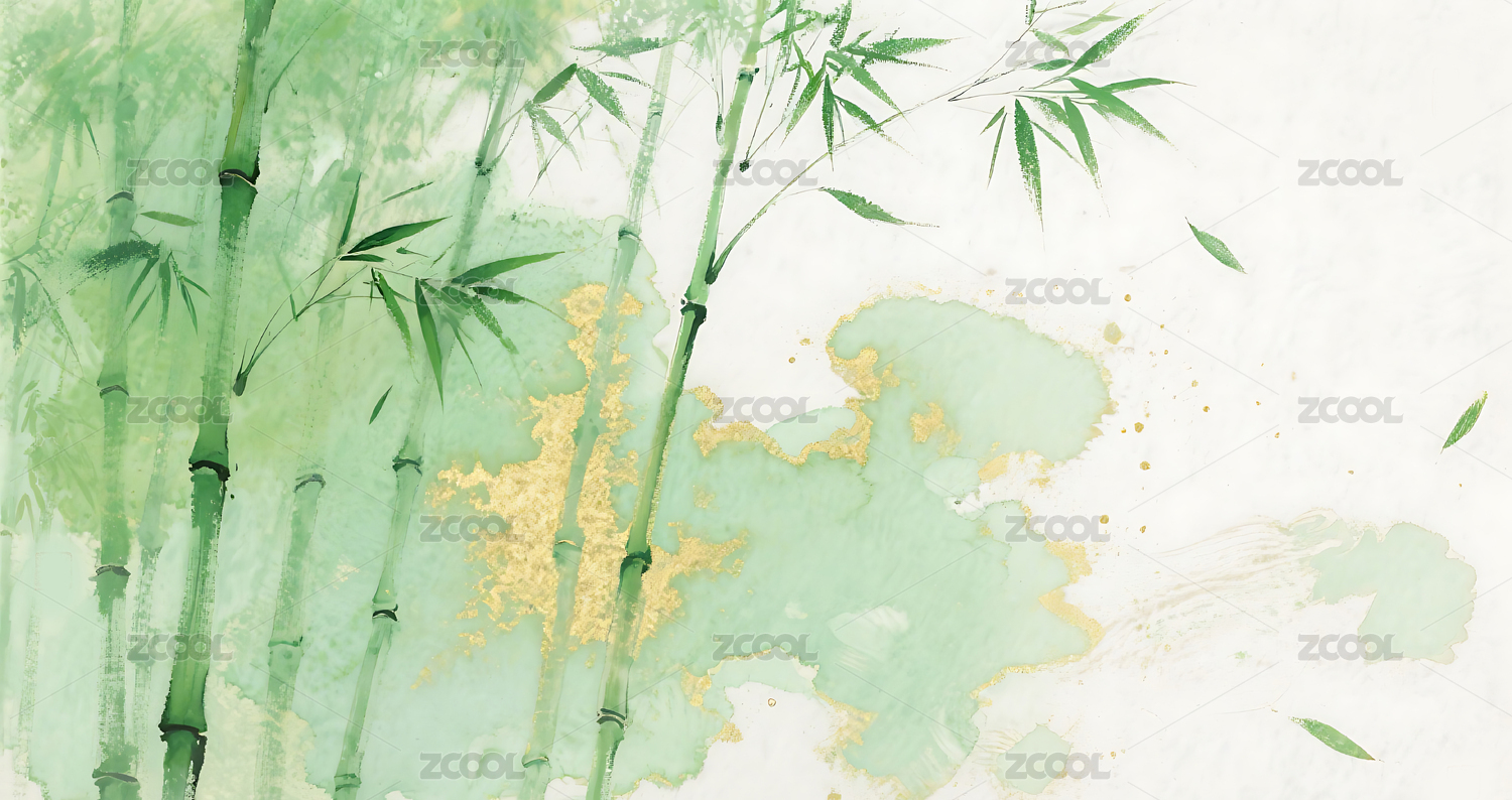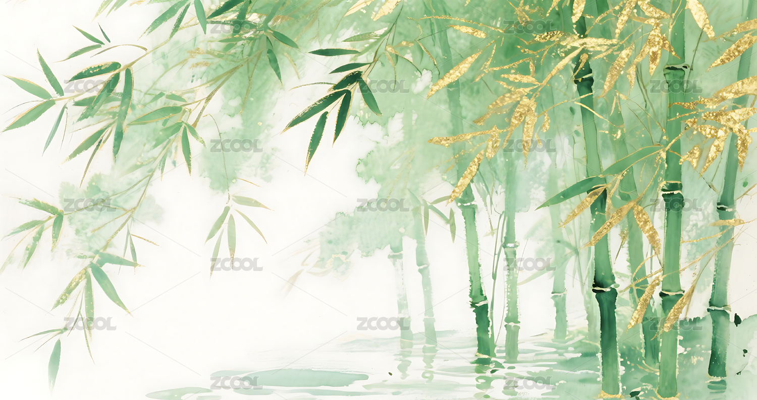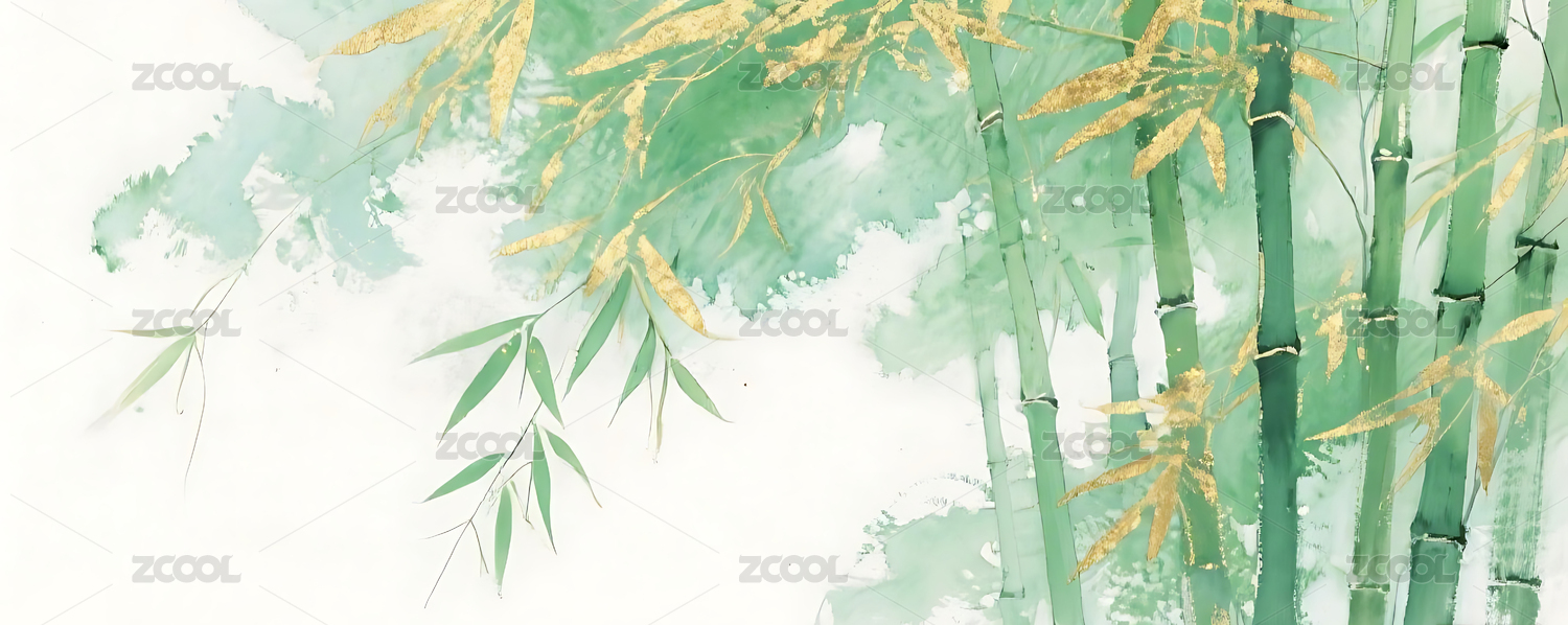 绿色,金色,竹叶,竹林,插画,背景,壁纸,晕染,水墨,中式