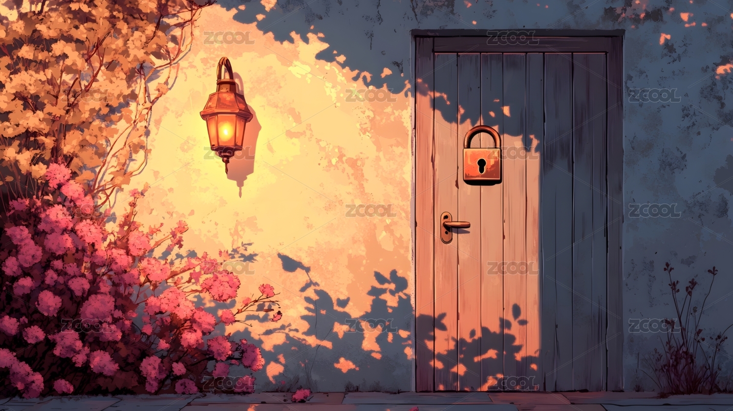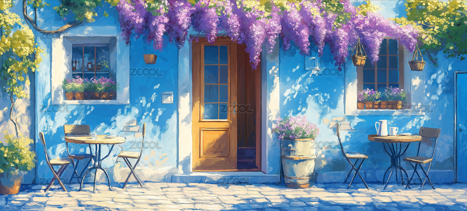 艺术,光影,色彩,装饰,蓝门,小屋,花丛,植物,墙壁,窗户