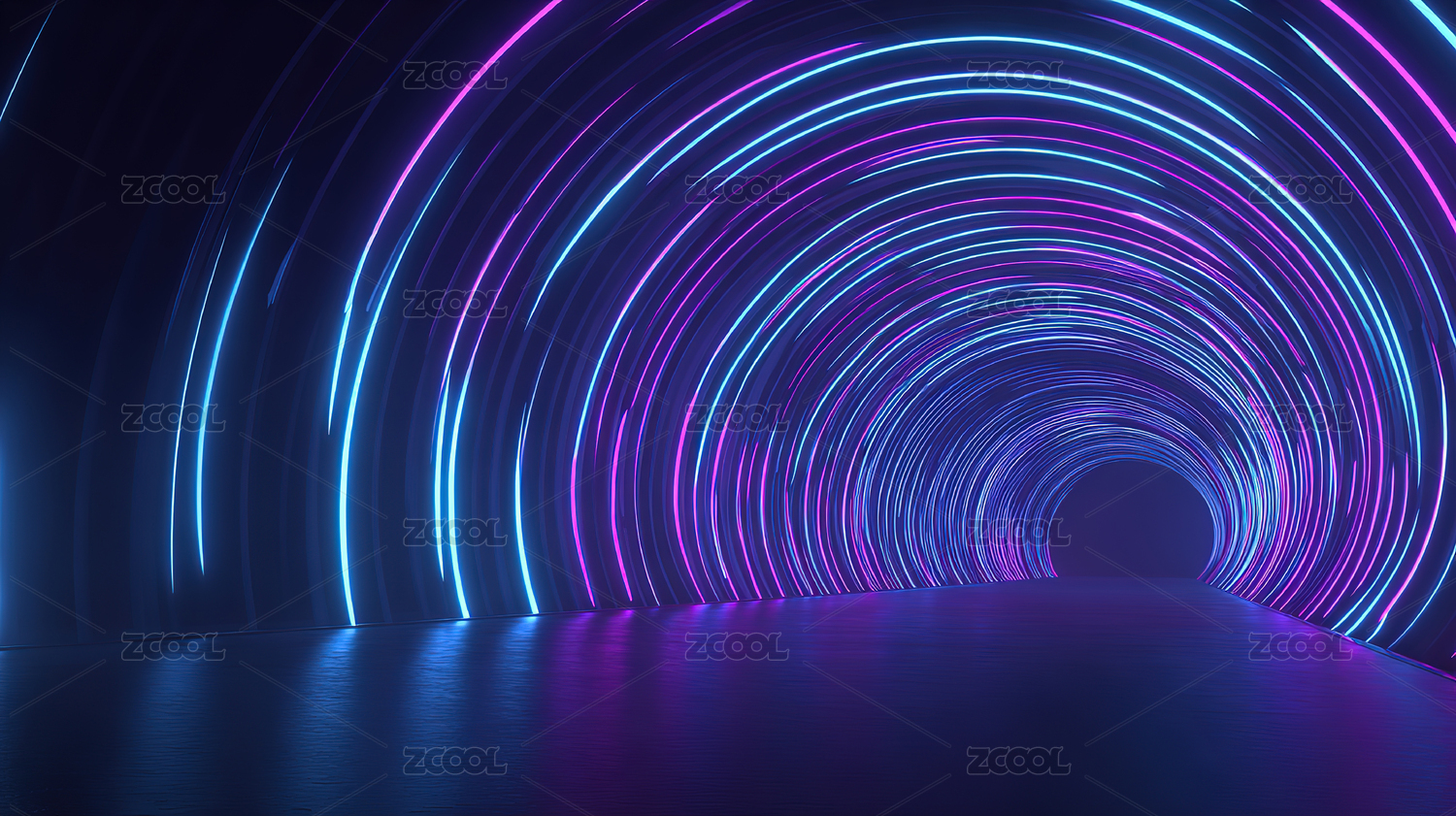 高科技,3D抽象,霓虹光效,深背景,对称构图,现代感,商业科技,冷色调,未来氛围,精确性