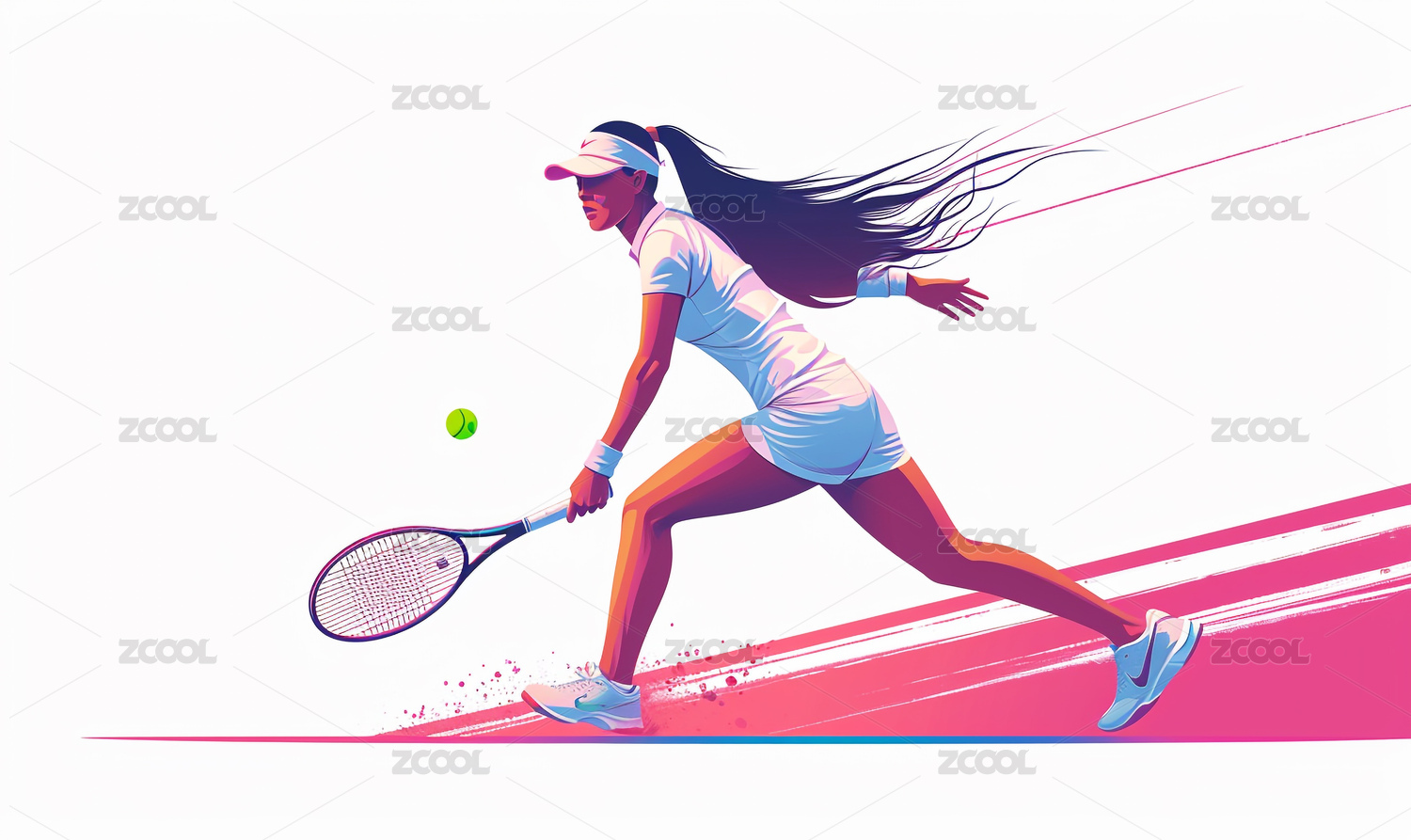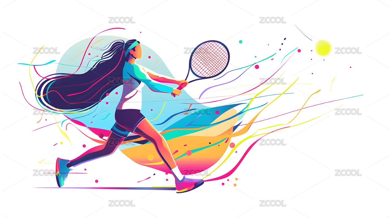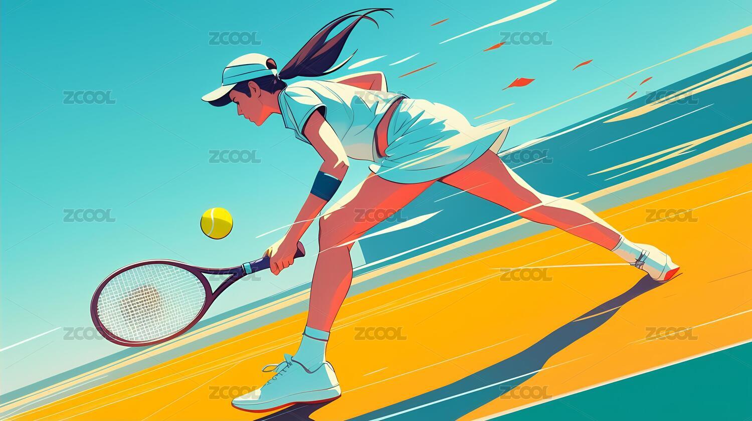 女运动员打网球色彩平面插图