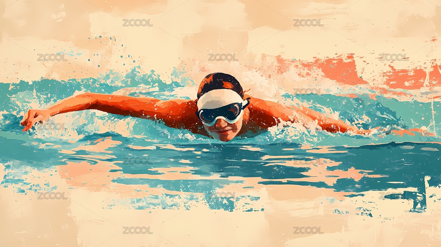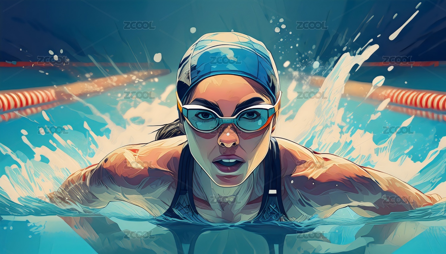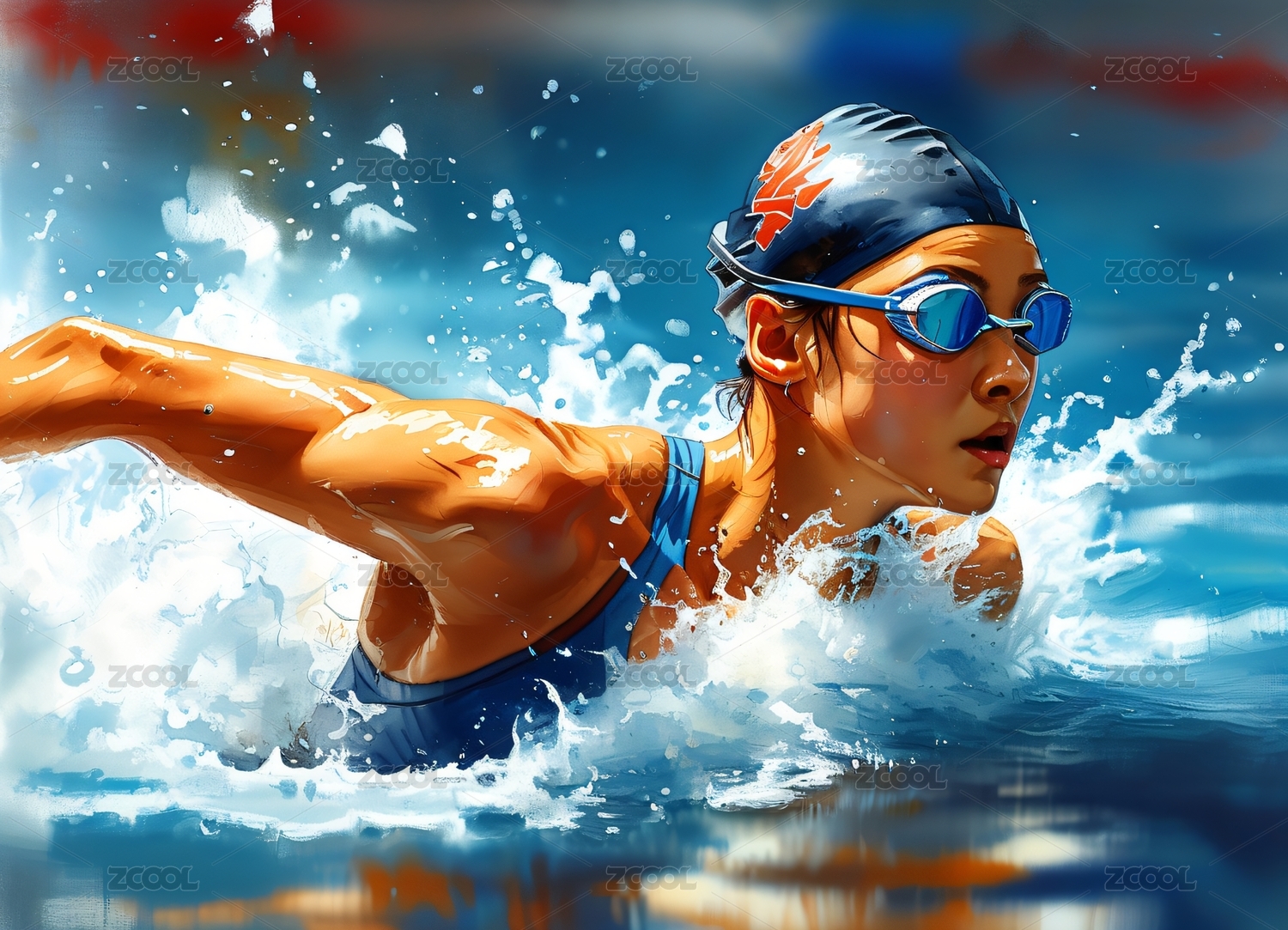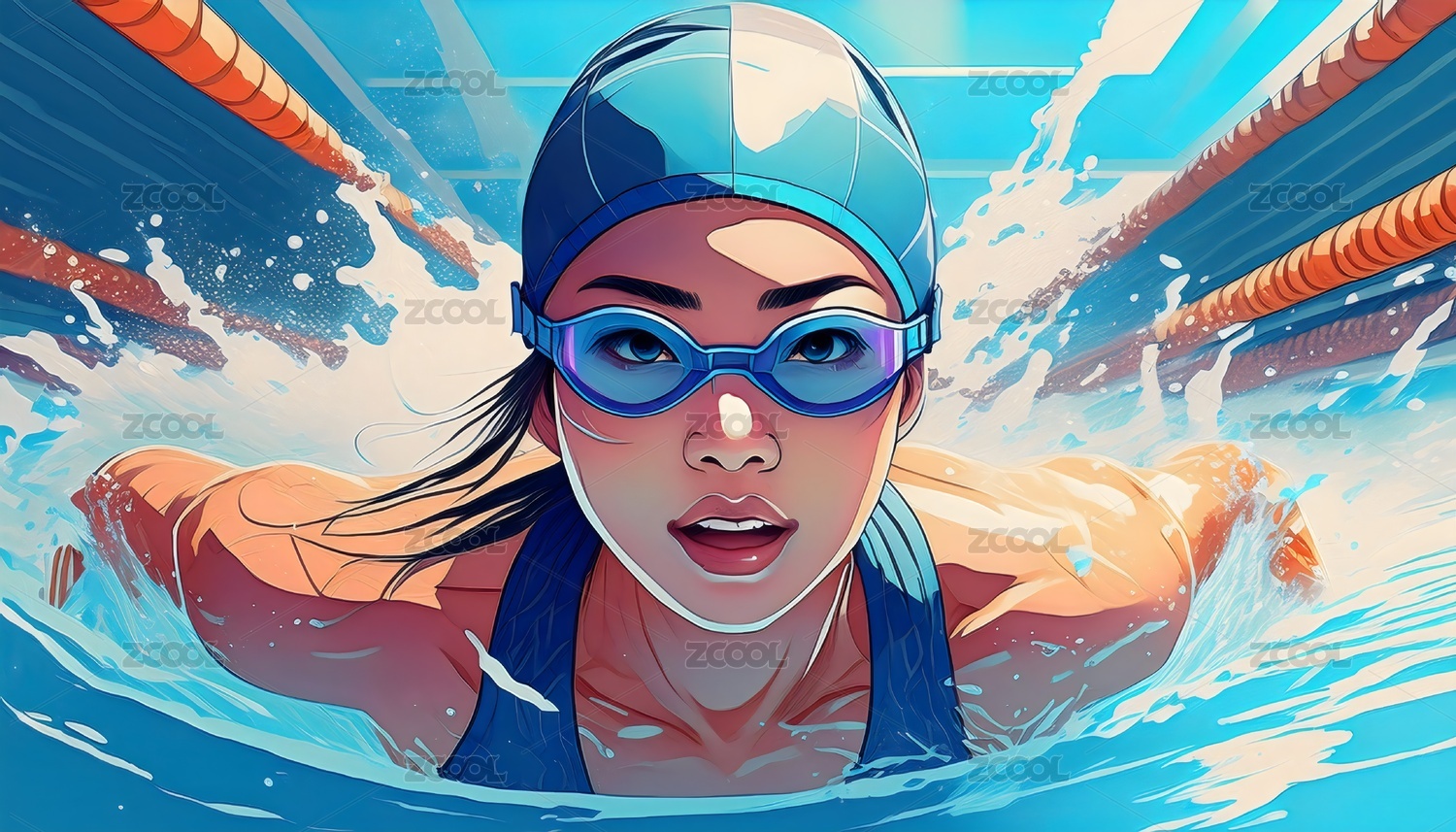 游泳的亚洲女运动员写实绘画