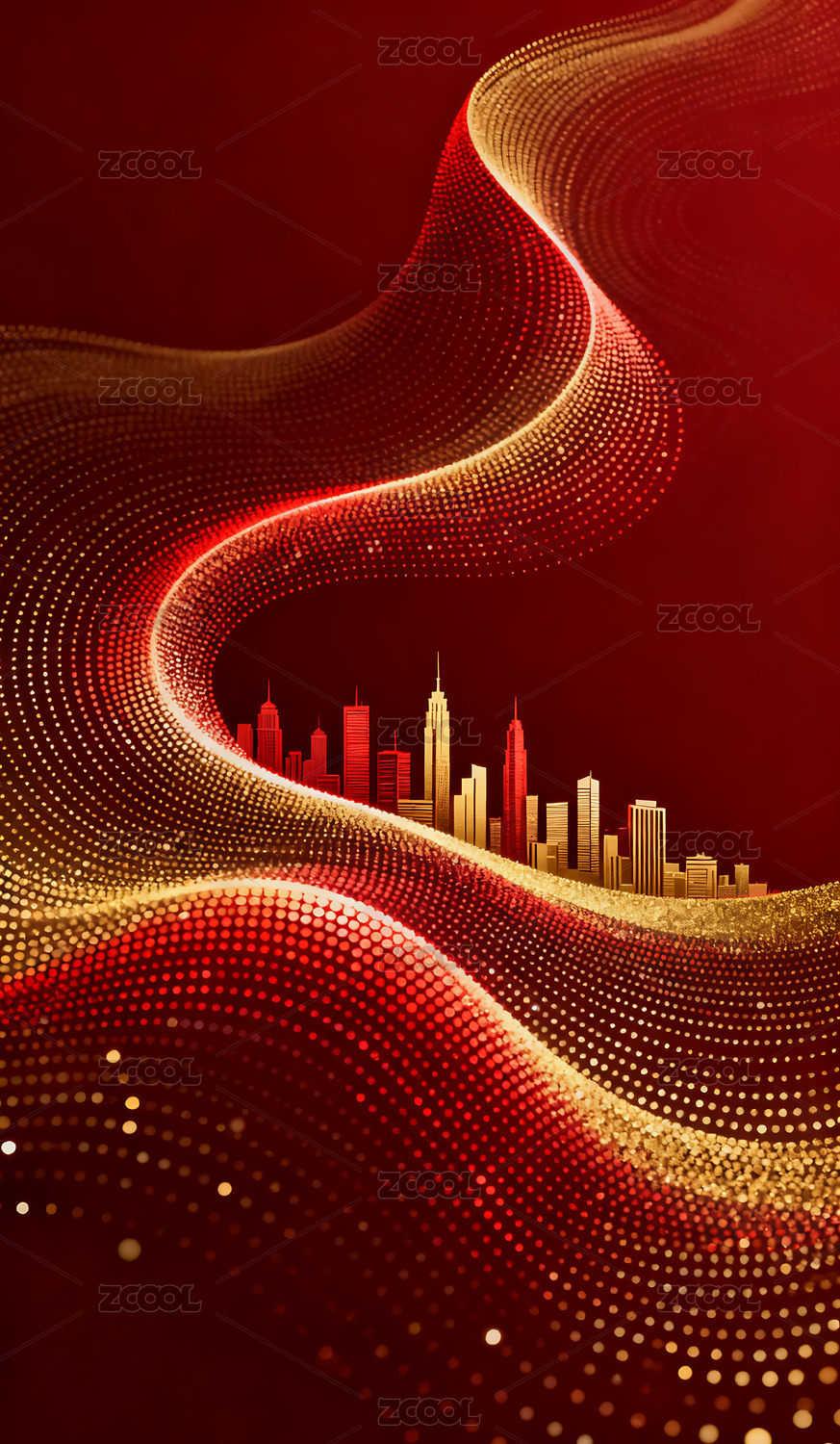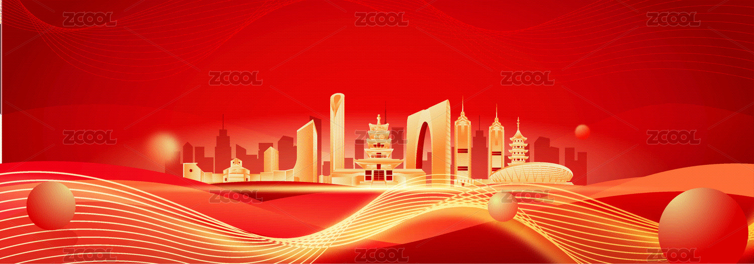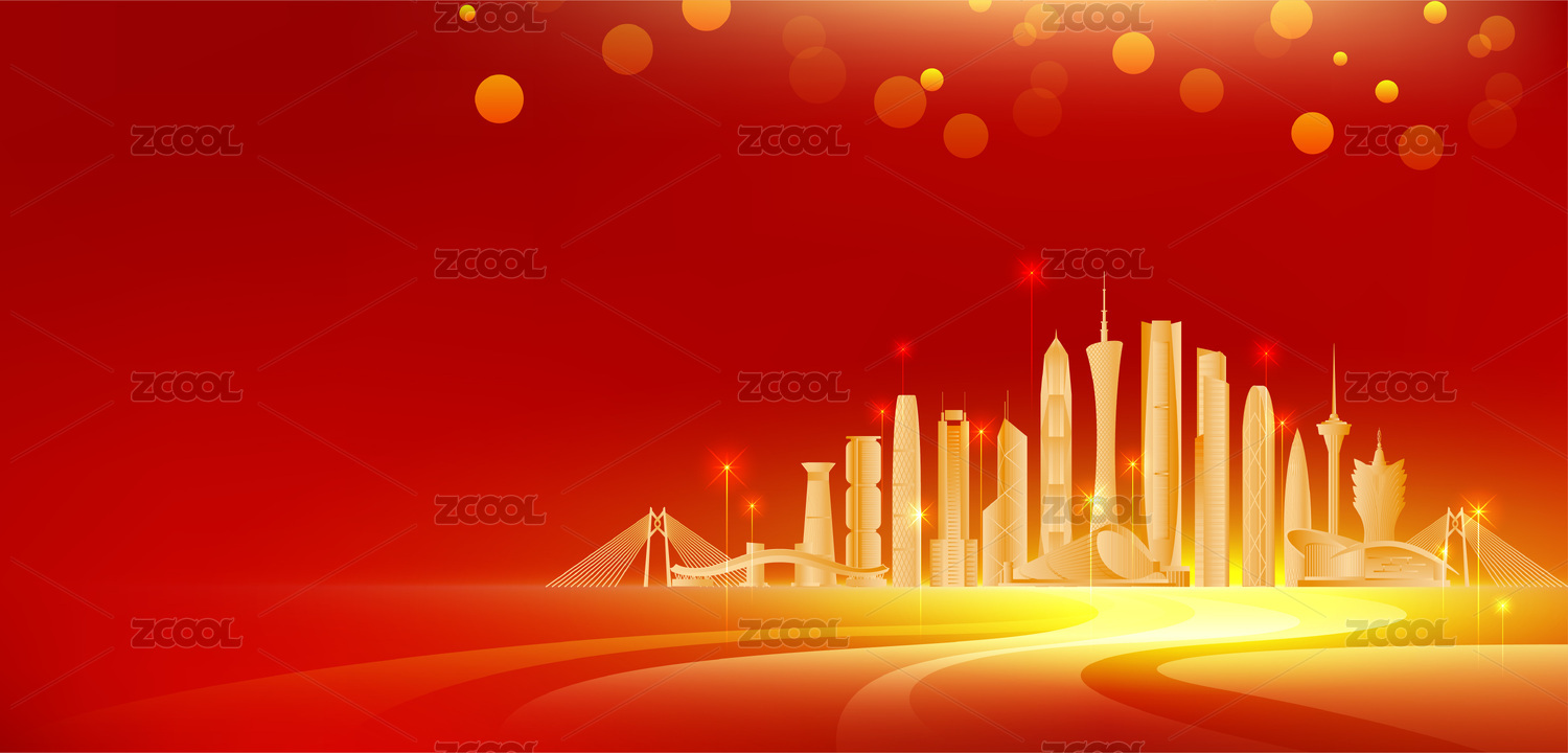 红色背景城市剪影与金色光效