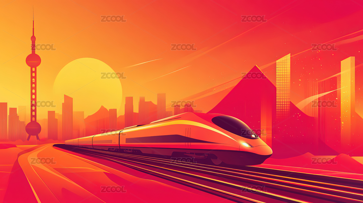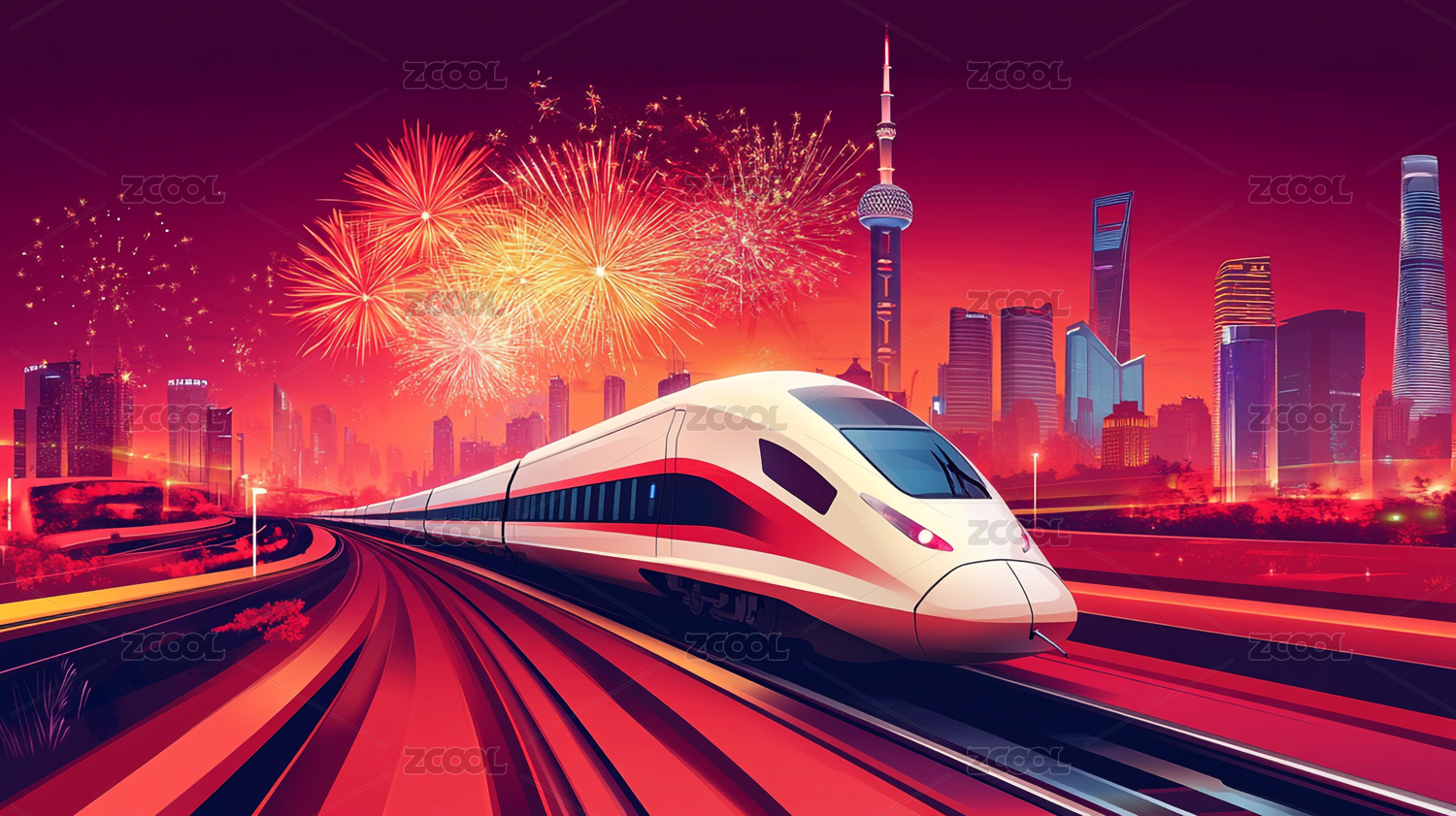 红色喜庆烟花绽放的背景下高铁动车春运素材